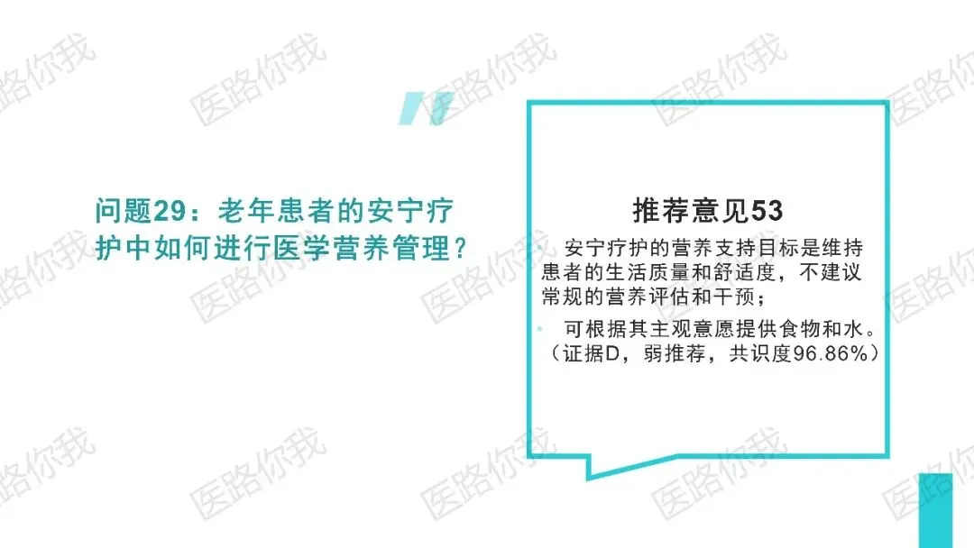 安宁疗护:不建议常规人工营养;尊重意愿,以舒适和生活质量为最高目标。