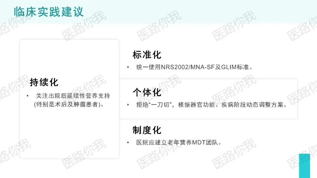 持续化:打通院内院外,重视出院后延续性营养支持(特别是术后/肿瘤/肌少症)。