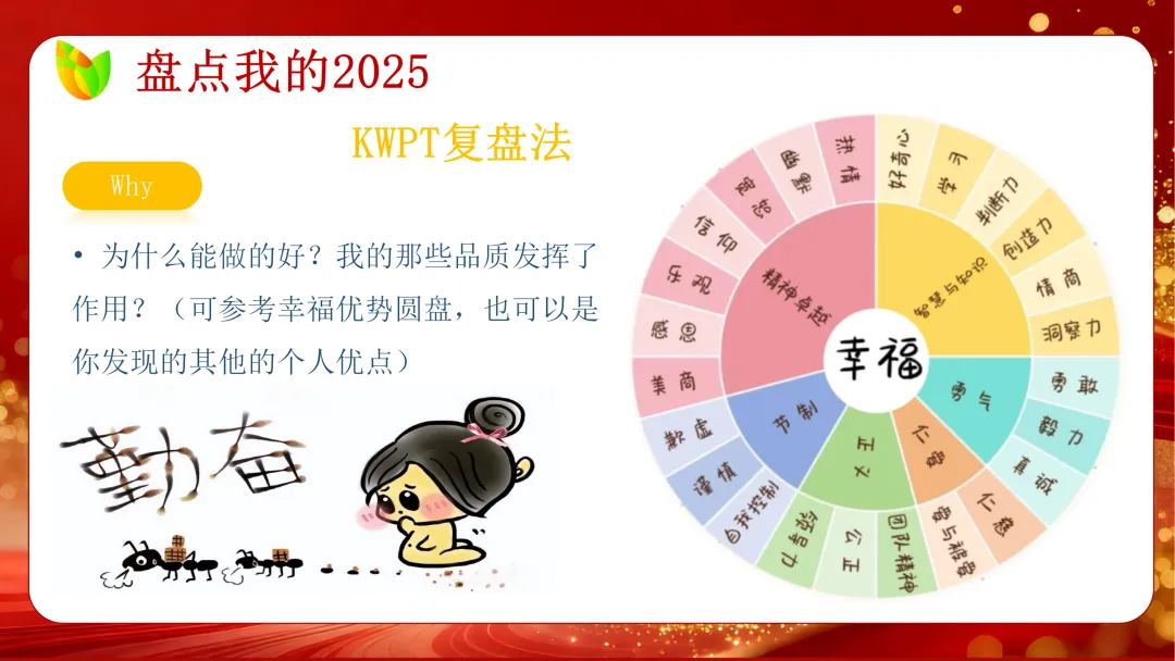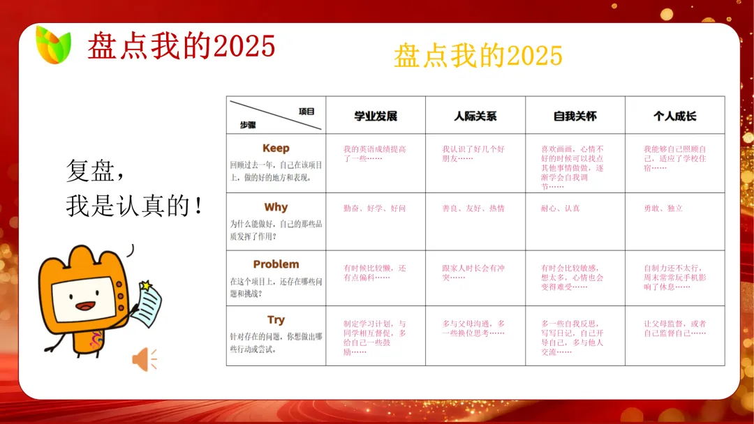 第二板块聚焦寒假复盘与 2025 盘点,融入 KPT、KWPT 复盘法,引导学生梳理过往收获与不足,制定专属 2026 成长计划,从学习、健康、生活多维度立下目标,告别拖延与浮躁;