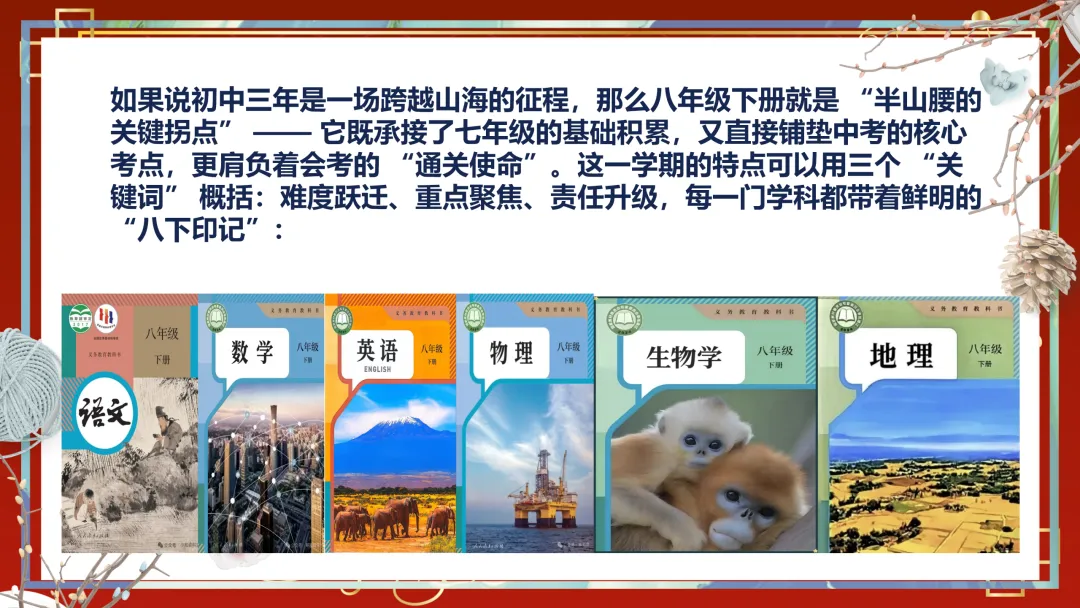 整份 PPT 紧扣八年级下册 “难度跃迁、重点聚焦、责任升级” 的学习特点,既有趣味互动环节,又有干货满满的学习方法指导,还有自我认知与成长规划的深度引导,图文并茂、逻辑清晰,班主任可直接投屏使用,无需额外修改。