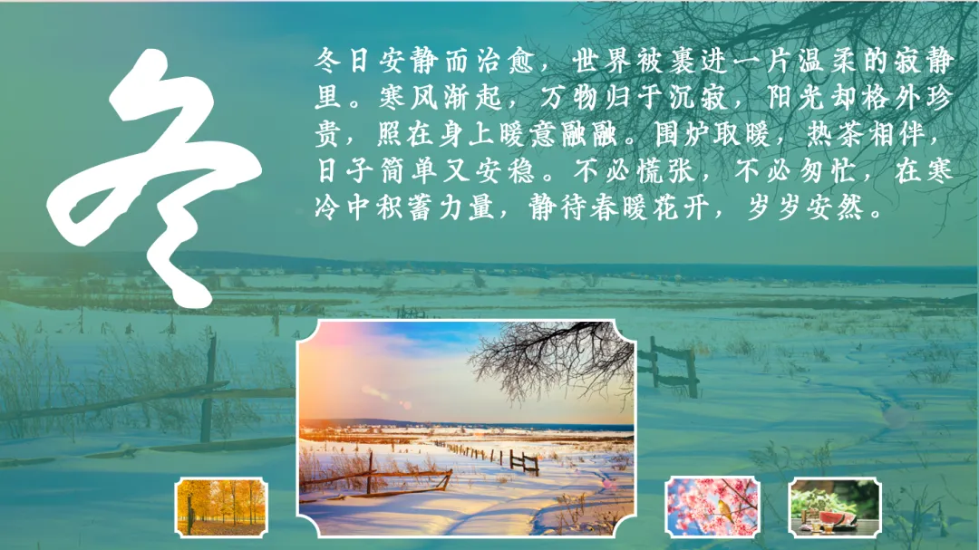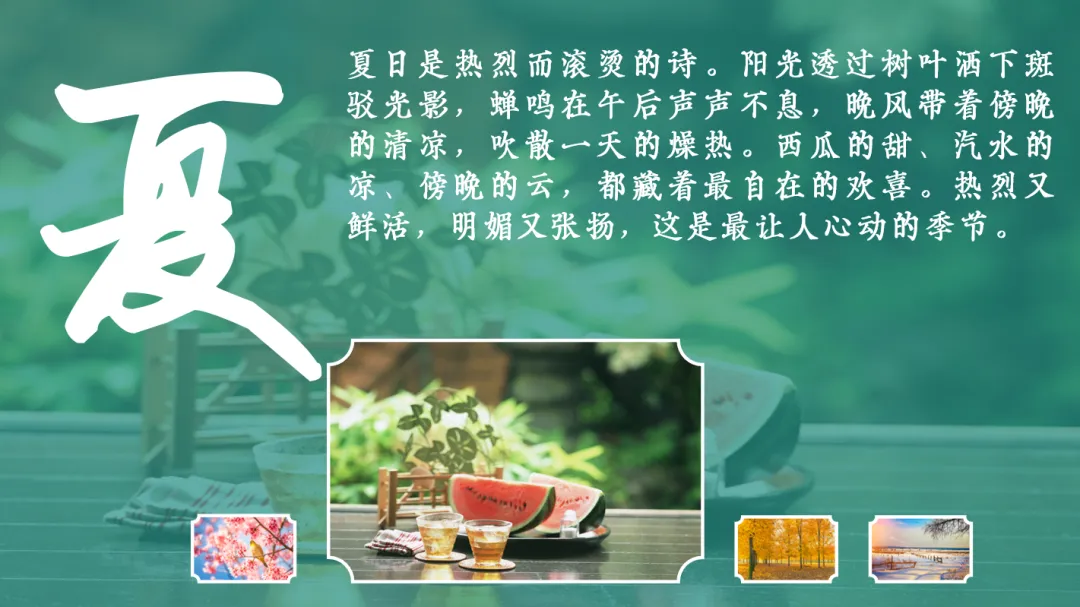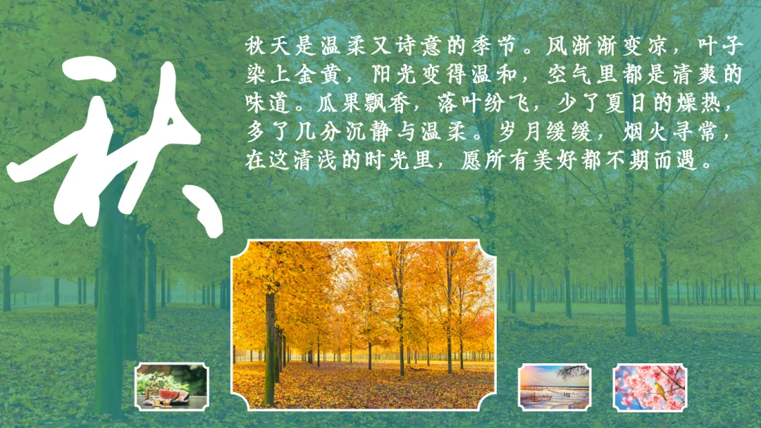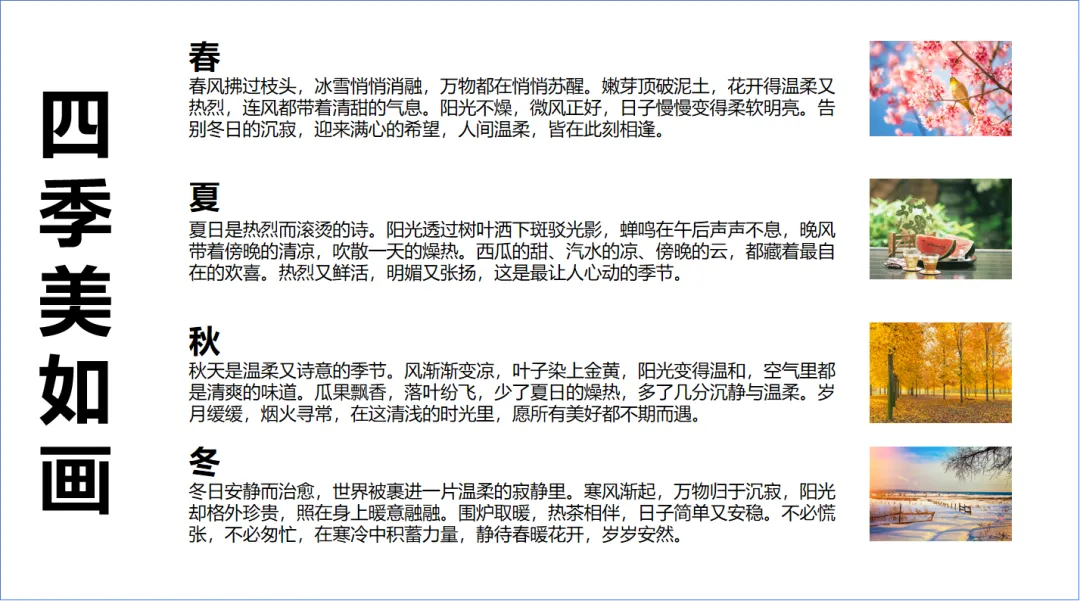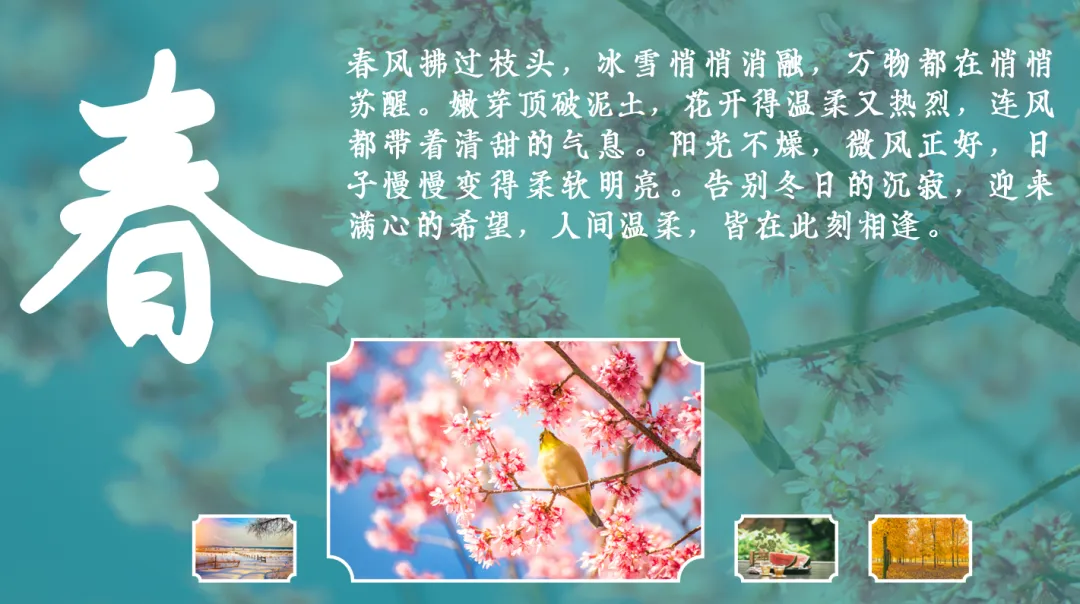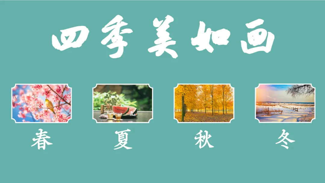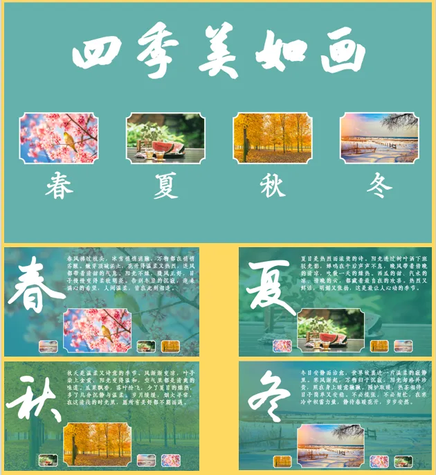 朋友给了我一份关于一年四季的素材,让我帮他做一份PPT。想着也不难,我就先做了一份封面给他,主要是让他看下排版、文字和配色是不是他想要的。朋友回复没问题后,我开始做春夏秋冬的分页。我的制作思路是:一个季节做一页PPT,每页排版、文字、配色等保持一致。我选择上下排版,文字在上边,还加了蒙版(这样,图片的亮度不会抢了整张PPT的风头),图片在下边,这样显得有层次感。每页PPT只使用一个图片,PPT背景选择一个季节对应的图片,加上蒙版后,能够突出文字效果。下方的图片加上边框,对应季节的图片放大,其他季节的图片缩小,既突出季节主题,也为后续添加动画效果做准备。最后,给每页PPT添加切换效果:【平滑】。来看下效果:以上就是我做这份《四季美如画》PPT的思路,想了解具体的内容或者有什么疑问,欢迎评论区留言。关注我,分享PPT制作的核心理念与设计原则、色彩搭配策略、配图风格、版式设计等方面的思路。