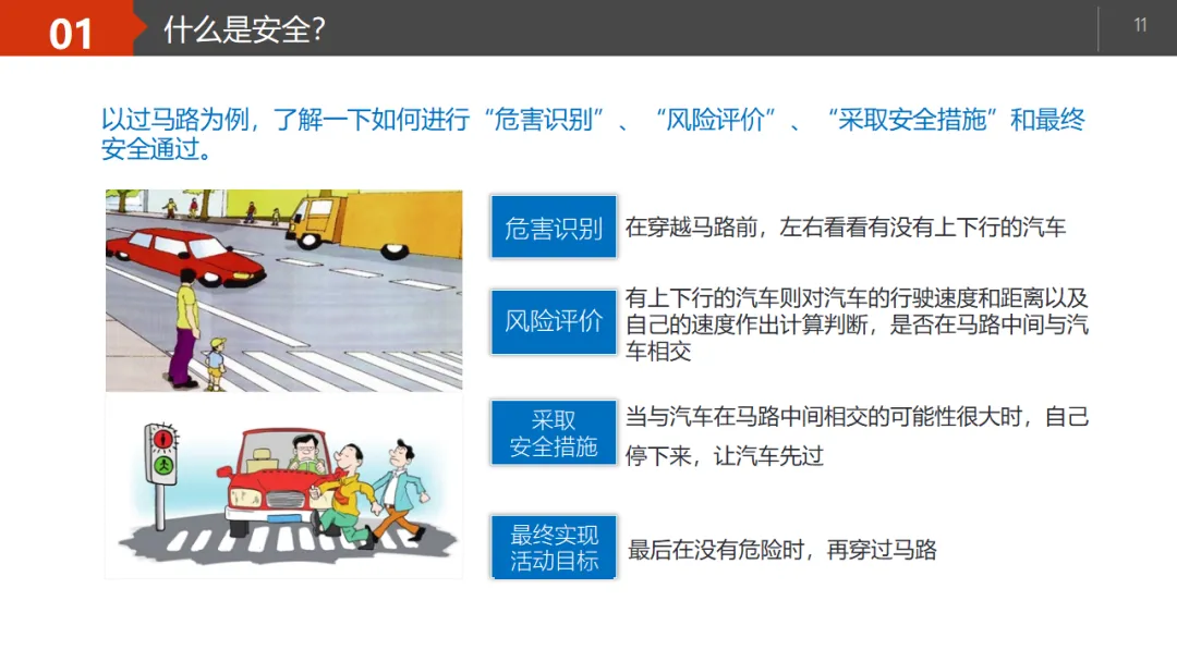 在穿越马路前,你要左右看看有没有上下行的汽车。这就是在识别"车辆撞击"这个危险因素。