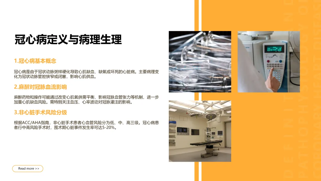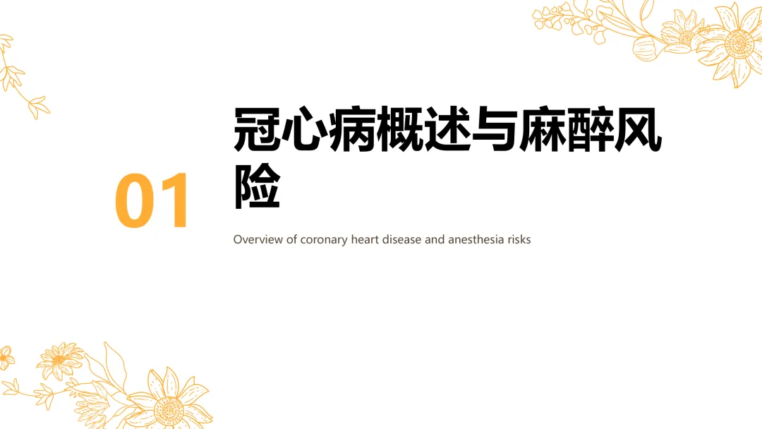 本PPT聚焦冠心病患者非心脏手术的麻醉管理,旨在为临床麻醉医师提供系统化、实用化的决策支持。开篇通过"冠心病患者非心脏手术麻醉风险高、管理复杂"的临床痛点切入,强调此类患者因心脏功能受损、合并症多,对麻醉药物选择、剂量控制及监测要求更为严苛,需兼顾手术需求与心血管稳定性。