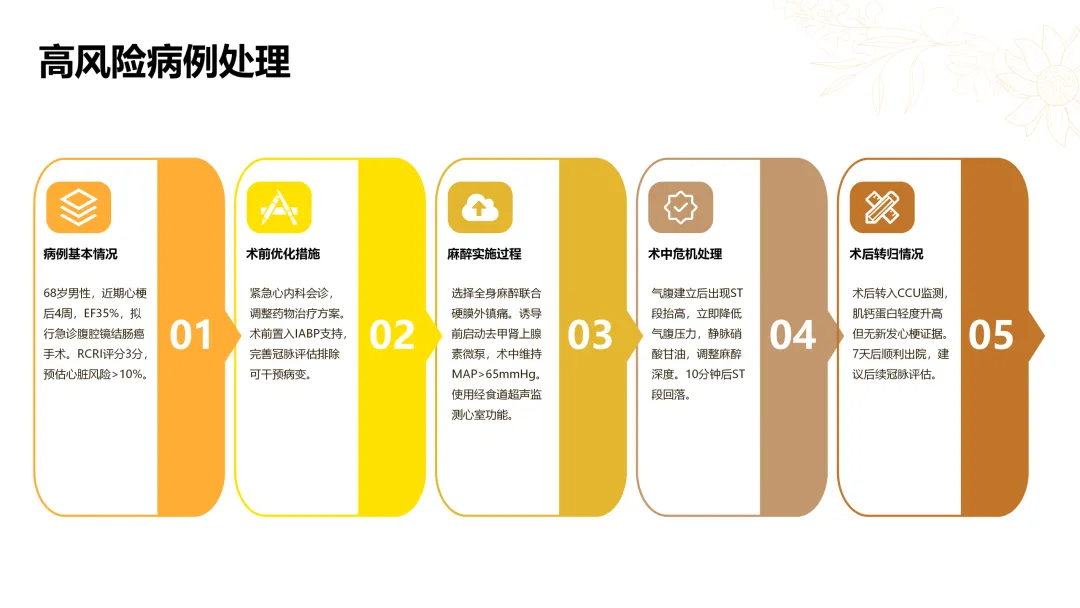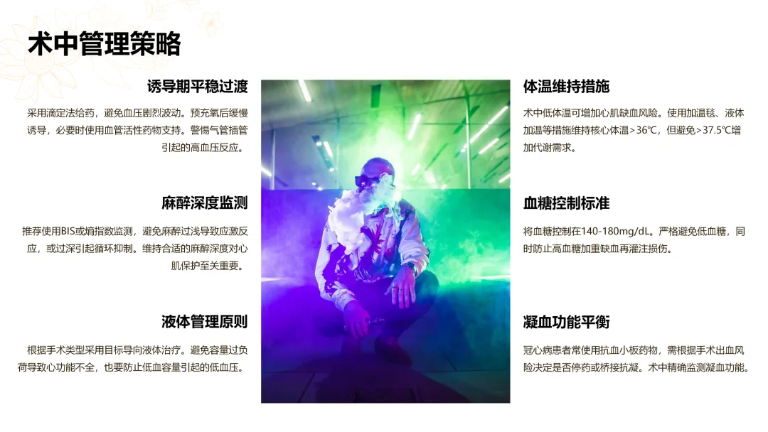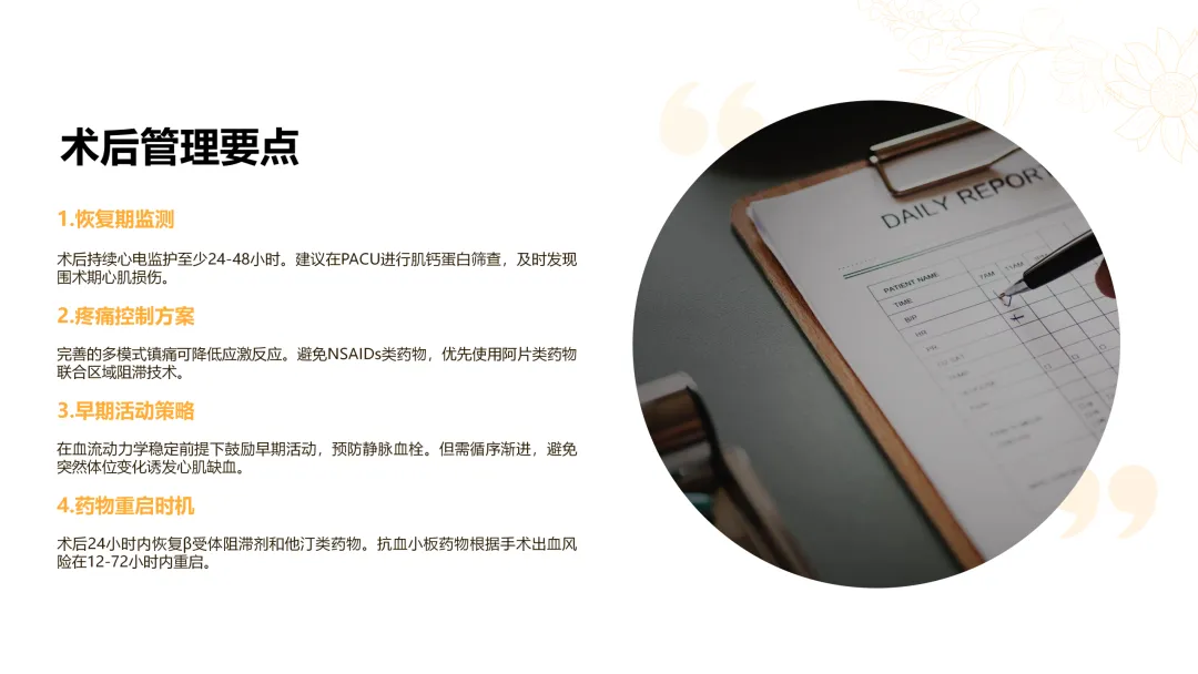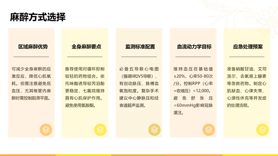 术后管理部分,强调苏醒期需持续监测心电图、血流动力学及疼痛评分,预防心肌梗死、心律失常等并发症。同时,结合患者恢复情况,逐步调整麻醉药物剂量,避免过度镇静或疼痛刺激导致的心脏应激。