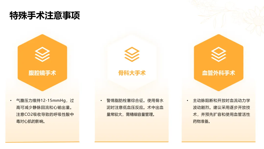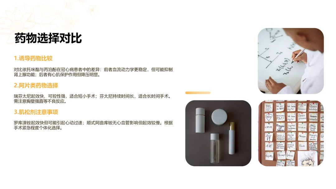 针对麻醉实施过程,PPT分步骤解析:从麻醉诱导时血流动力学监测(如血压、心率、SpO₂)的要点,到术中维持阶段如何通过调整药物剂量、液体管理及机械通气参数,实现"麻醉深度与手术刺激的动态平衡"。特别指出,需警惕低血压、心肌缺血加重等并发症,及时采取血管活性药物或正性肌力药物干预。