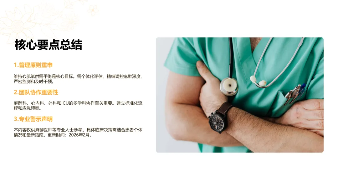 本PPT通过"风险评估-药物选择-动态调整-术后监护"的全流程管理框架,结合临床案例与最新指南,为冠心病非心脏手术麻醉提供标准化操作路径,助力麻醉医师提升此类高危患者的麻醉安全性,降低围术期心血管事件发生率。