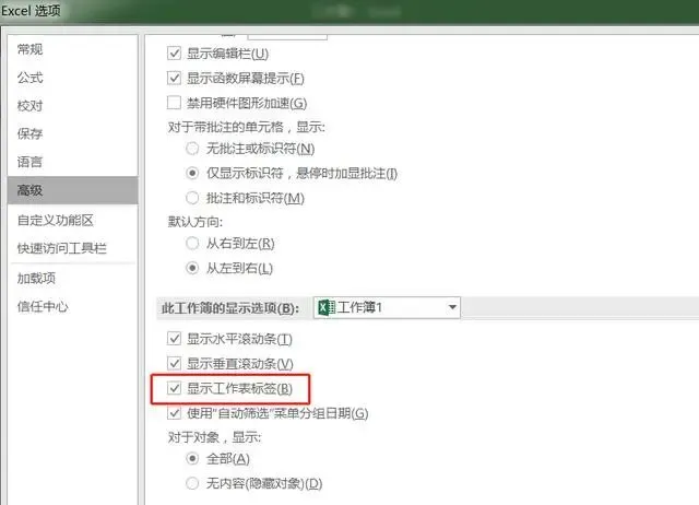 操作方法:点击“文件—选项—高级”功能,找到其中的“显示工作表标签”,将其取消勾选。这样在工作簿内,就无法查看到其他的工作表了。