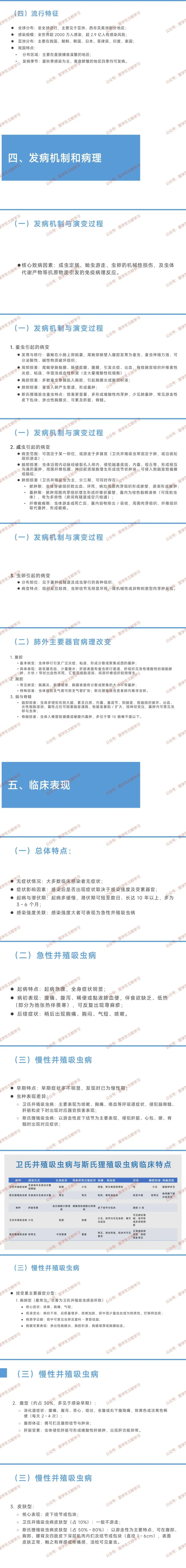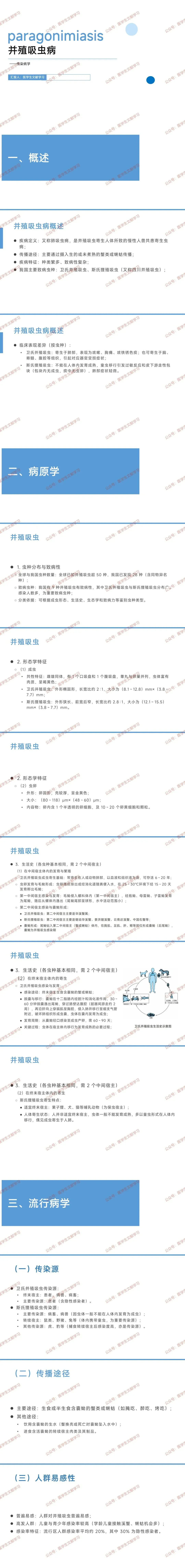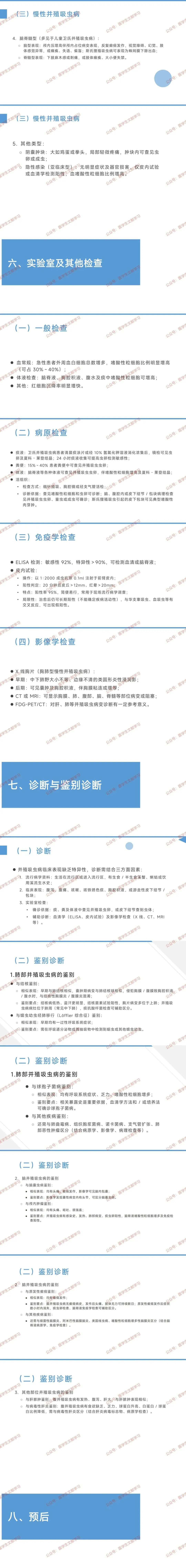 定义:又称肺吸虫病,是并殖吸虫寄生人体所致的慢性寄生虫病,人兽共患,传播途径以生食蟹类 / 蝲蛄为主,临床表现因虫种而异。