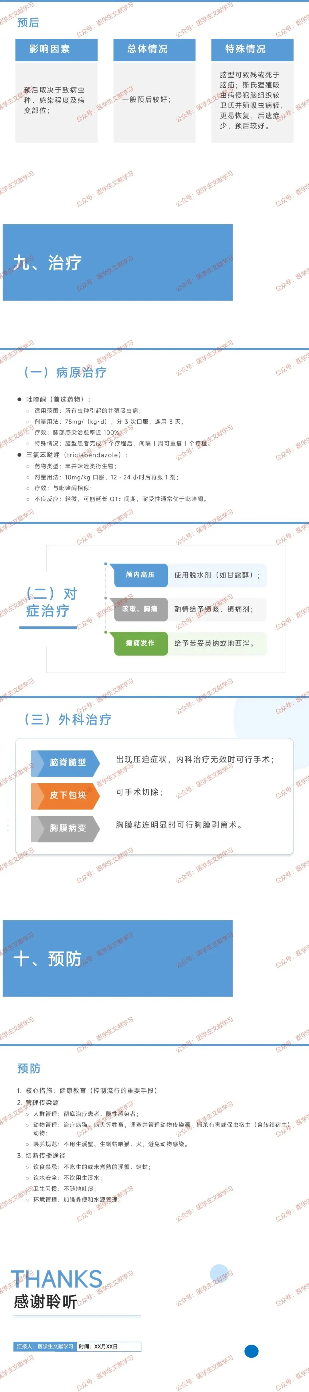 外科治疗:脑脊髓型出现压迫症状、皮下包块、胸膜粘连严重者,可行手术切除或胸膜剥离术。
