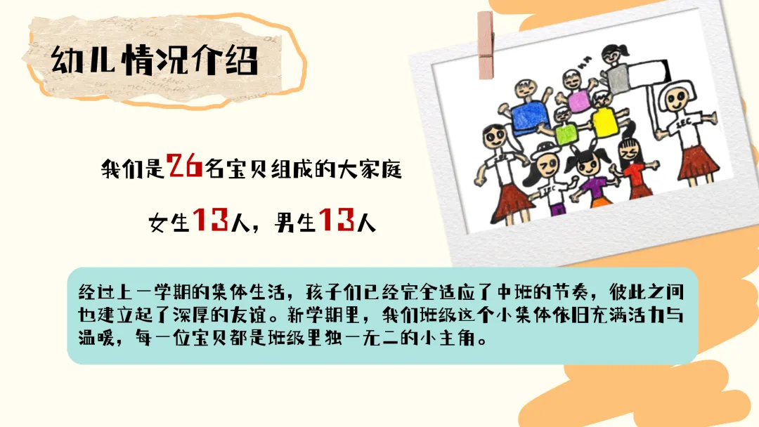 首先,向大家介绍我们班级的整体情况。我们班是由26 名宝贝组成的温暖大家庭,其中女生 13 人,男生 13 人,男女比例均衡。经过上一学期的集体生活,孩子们已经完全适应了中班的学习和生活节奏,彼此之间建立了深厚的友谊,班级氛围非常融洽。每一位宝贝都有自己独特的闪光点,都是这个集体中不可或缺的小主角。