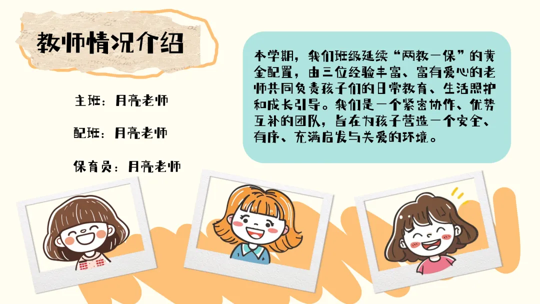 在师资配置上,我们延续了“两教一保” 的黄金配置,由我、配班月亮老师以及保育员月亮老师共同负责孩子们的日常教育、生活照护和成长引导。我们三位老师都有着丰富的幼教经验,充满爱心和责任心,是一个紧密协作、优势互补的团队。在工作中,我们会各司其职、密切配合,努力为孩子们营造一个安全、有序、充满启发与关爱的成长环境。