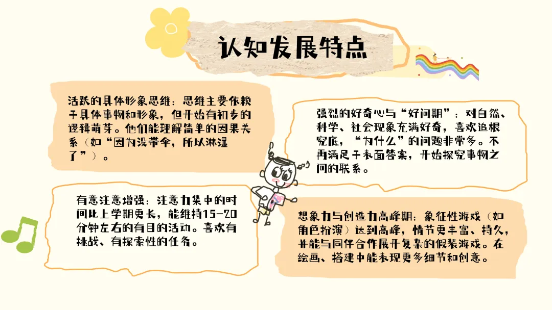 在认知发展上,孩子们处于活跃的具体形象思维阶段,思维主要依赖于具体事物和形象,但已经开始有了初步的逻辑萌芽,能够理解简单的因果关系,比如“因为没带伞,所以淋湿了”。同时,这个阶段的孩子好奇心极强,进入了 “好问期”,对自然、科学、社会现象充满好奇,总爱追根究底地问 “为什么”,不再满足于表面答案,开始主动探究事物之间的联系。此外,孩子们的有意注意也有所增强,注意力集中的时间比上学期更长,能维持 15-20 分钟左右的有目的活动,并且喜欢有挑战、有探索性的任务。想象力与创造力也进入了高峰期,象征性游戏,比如角色扮演达到高峰,游戏情节更丰富、更持久,还能与同伴合作展开复杂的假装游戏,在绘画、搭建中也能表现出更多细节和创意。