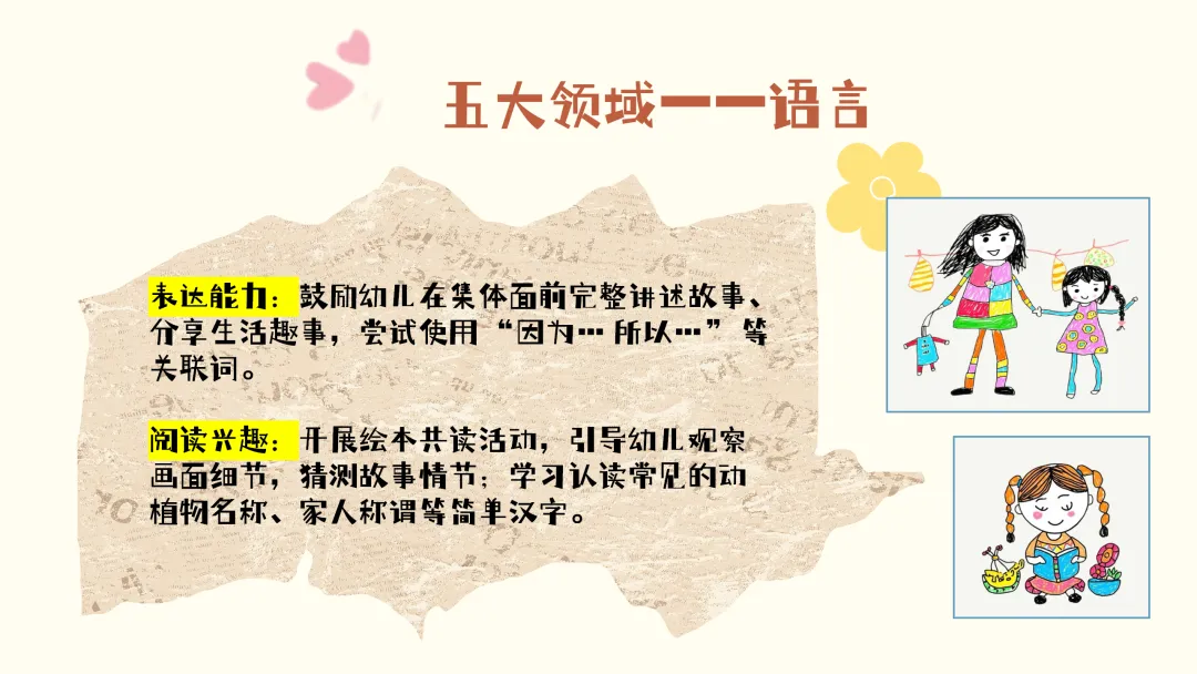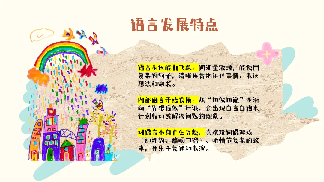 在语言发展方面,孩子们的语言表达能力实现了飞跃,词汇量激增,能使用复杂的句子,清晰连贯地讲述事情、表达自己的想法和需求。内部语言开始发展,从“边做边说” 逐渐向 “先想后做” 过渡,有时会自言自语来计划自己的行动或解决问题。同时,孩子们对语言本身产生了浓厚兴趣,喜欢玩词语游戏,比如押韵、编顺口溜,也爱听情节复杂的故事,并乐于进行复述和表演。
