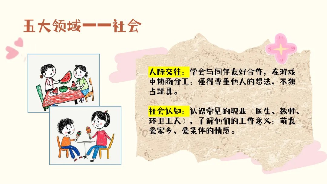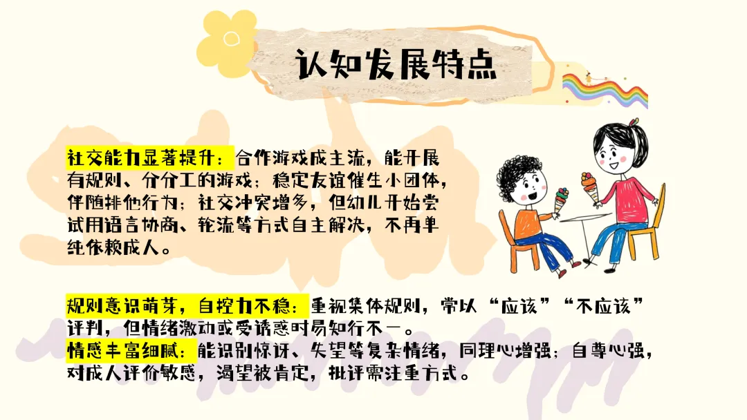 在社交与情感发展上,孩子们的社交能力显著提升,合作游戏成为主流,能够开展有规则、有分工的游戏;稳定的友谊会催生小团体,同时也可能伴随一定的排他行为;虽然社交冲突有所增多,但孩子们开始尝试用语言协商、轮流等方式自主解决,不再单纯依赖成人。规则意识开始萌芽,但自控力还不够稳定,他们重视集体规则,常以“应该”“不应该” 来评判事物,但在情绪激动或受到诱惑时,容易出现知行不一的情况。此外,孩子们的情感变得丰富细腻,能够识别惊讶、失望等复杂情绪,同理心也不断增强;同时自尊心较强,对成人的评价非常敏感,渴望得到肯定和表扬,所以我们在批评孩子时,需要特别注重方式方法。