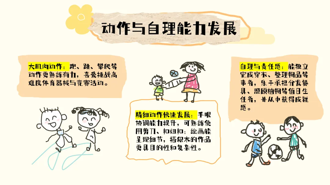 在动作与自理能力发展上,孩子们的大肌肉动作越来越熟练有力,跑、跳、攀爬等动作技能不断提升,喜爱挑战高难度的体育器械和竞赛活动。精细动作也在快速发展,手眼协调能力明显提高,能够熟练使用剪刀、扣纽扣;绘画时能呈现更多细节,搭积木的作品也更具目的性和复杂性。在自理与责任感方面,孩子们已经能独立完成穿衣、整理物品等事务,并且乐于承担分发餐具、照顾植物等值日生任务,能从中获得满满的成就感。