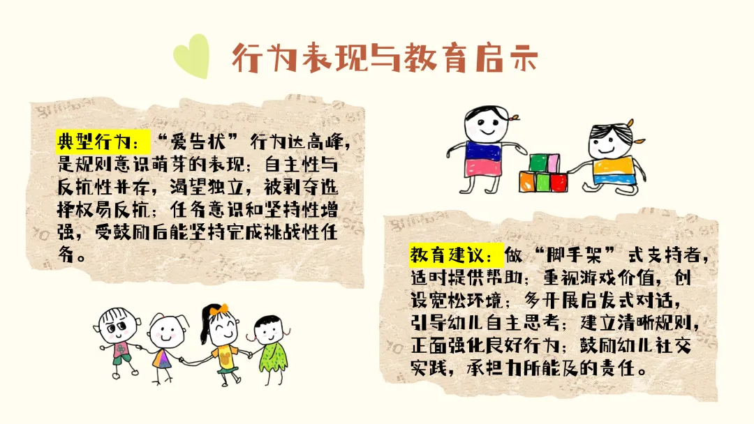 针对这些年龄特点,孩子们会有一些典型行为,比如“爱告状” 行为达到高峰,这其实是规则意识萌芽的表现;自主性与反抗性并存,渴望独立,当被剥夺选择权时容易产生反抗情绪;任务意识和坚持性有所增强,受到鼓励后能够坚持完成有挑战性的任务。基于此,我们给出的教育建议是:做 “脚手架” 式的支持者,在孩子需要时适时提供帮助,而非包办代替;重视游戏的价值,为孩子创设宽松、自由的游戏环境;多开展启发式对话,引导幼儿自主思考,培养独立解决问题的能力;建立清晰明确的规则,对孩子的良好行为进行正面强化;鼓励幼儿积极参与社交实践,让他们承担力所能及的责任,在实践中提升综合能力。
