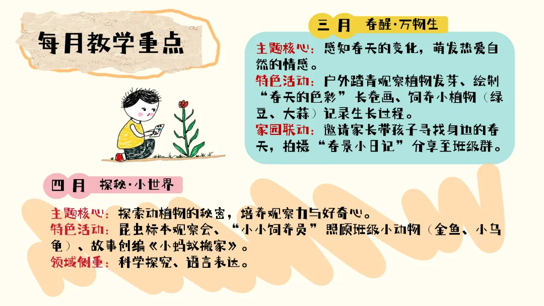 三月的主题是“春醒・万物生”,核心是让孩子们感知春天的变化,萌发热爱自然的情感。我们会开展户外踏青观察植物发芽、绘制 “春天的色彩” 长卷画、饲养小植物(绿豆、大蒜)并记录生长过程等特色活动。同时也希望家长们能积极参与家园联动,带孩子寻找身边的春天,拍摄 “春景小日记” 分享至班级群。