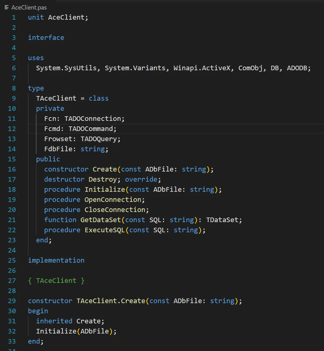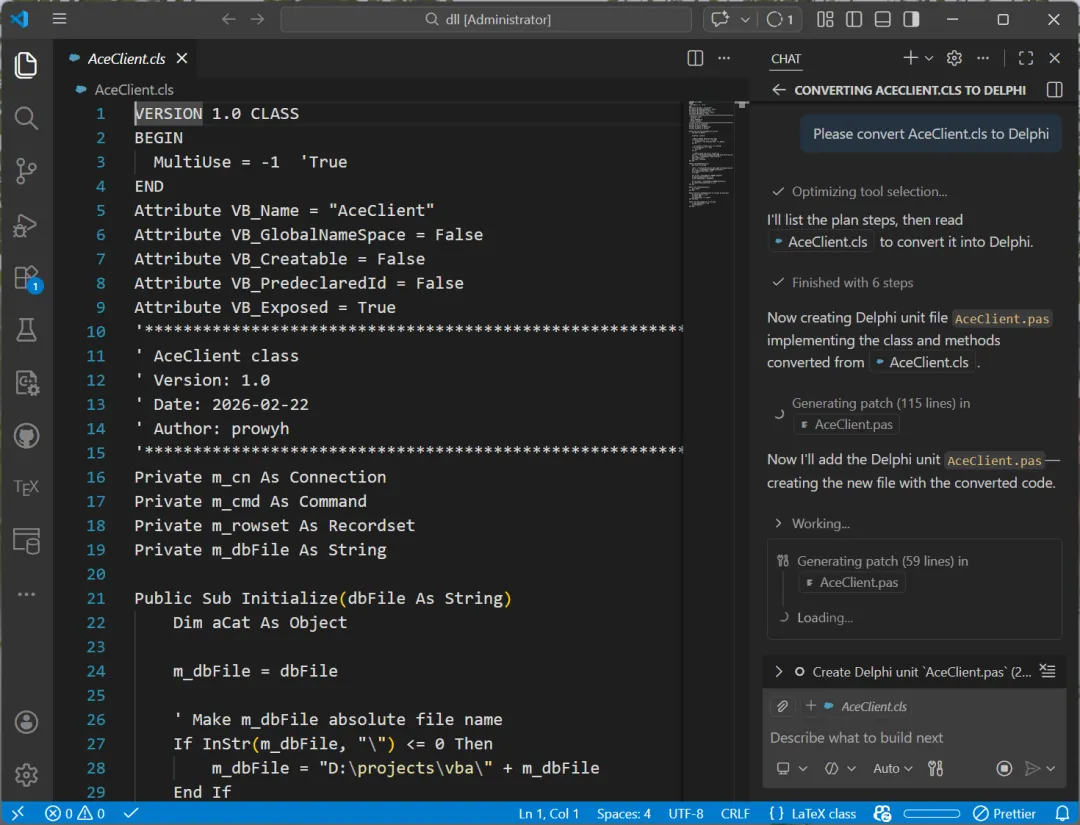 现在,我们以《Excel 编程 -- 再谈访问数据库》中的写入/读出 Access 数据库为例,说明将 VBA 代码转换为 Delphi DLL 的过程。访问 Access 数据库的例子中包括了类 AceClient 以及 AceTestModule 中的 AceTest、WriteDataToAccess、ReadDataFromAccess 几个过程。首先,我们在 VS Code 中让 Copilot 做初步转换:Copilot 转换成的 Delphi 代码只能作为雏形,还是需要手工打磨,形成最终版本,如下所示:VBA 中的 AceClient 类转换为 Delphi 的 TAceClient。Delphi 的 Class 可以定义自己的构造函数,如图所示,TAceClient.Create 构造函数带一个参数,ADBFile。所以,TAceClient 类的实例化可以写成:var aClient: TAceClient;begin aClient := TAceClient('MyDb.accdb'); // ...end;