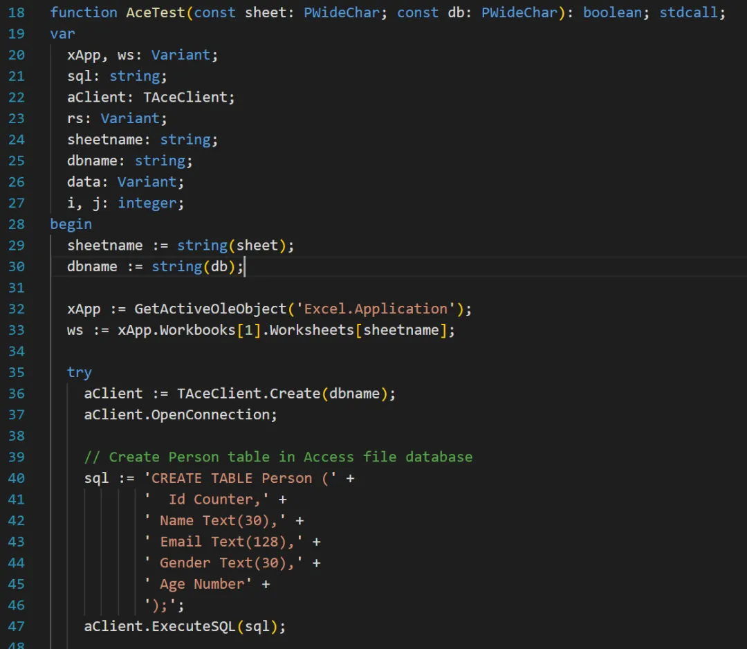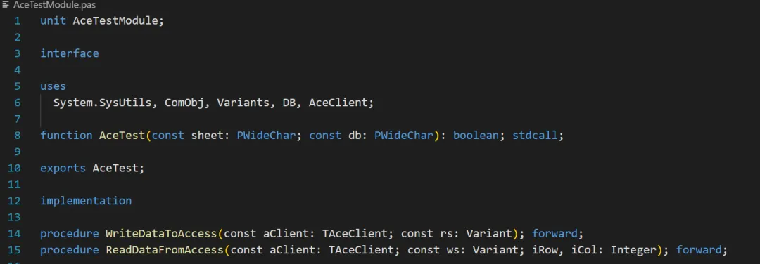同样,AceTestModule 也是先通过 Copilot 进行初步转换,再手工打磨成为能够使用的最终版本:在这个文件头部,我们看到,AceTest 通过 exports 指令声明为 DLL 中向外呈现的接口,而 WriteDataToAccess 和 ReadDataFromAccess 都只是由 AceTest 调用的内部过程,外部不可见。function AceTest(const sheet: PWideChar; const db: PWideChar): Boolean; stdcall;
