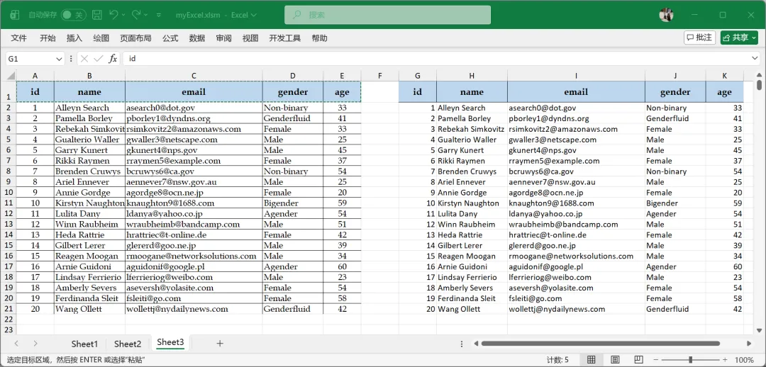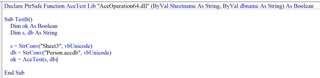 与 VBA 中的 Sub AceTest 不同,改写后的 AceTest 变成了一个函数,且该函数的调用规范遵循 stdcall,这是为了符合 Windows API 的规范。该函数接受两个参数:一个需要操作的工作表名称,一个需要生成的 Access 数据库文件名。仔细查看,其实 Delphi 的代码与 VBA 的代码相似度很高,这也使得 VBA 代码到 Delphi 代码的转换比较容易(相对于转换为 C/C++ 而言)。AceOperation.dll 的源代码包含两个模块:AceClient.pas 和 AceTestModule.pas,向外呈现的接口只有一个:AceTest 函数。为了适应不同环境,可以将编译后的 64 位 DLL 命名为 AceOperation64.dll,而将 32 位的 DLL 命名为 AceOperation32.dll。这是我们的 Excel 数据集。我们的任务是,将这个数据集写入 Access 数据库,然后再读出 Access 数据库中的数据,写入同一个工作表的右侧。首先声明 DLL 中的接口函数 AceTest,然后在 TestIt 过程中调用这个函数 AceTest 来完成我们的任务。此时,除以上几行代码之外,VBAProject 中不再包含其他的 VBA 代码。最后结果如下:此图与《Excel 编程 -- 再谈访问数据库》中的结果完全一样。说明我们的转换是成功的。很多人对于现在还在谈论 Delphi 似乎不以为然,认为 Delphi 已经是明日黄花。其实不然,从我们今天的例子看,Delphi 至少可以作为 VBA 源代码的“保护神”而存在!😄注:为了节省篇幅,Delphi 代码只显示了一部分。有需要 Delphi 代码的朋友,可以私信索取。