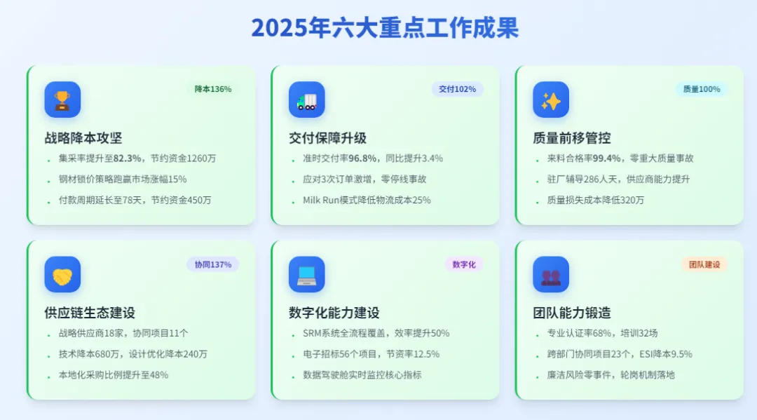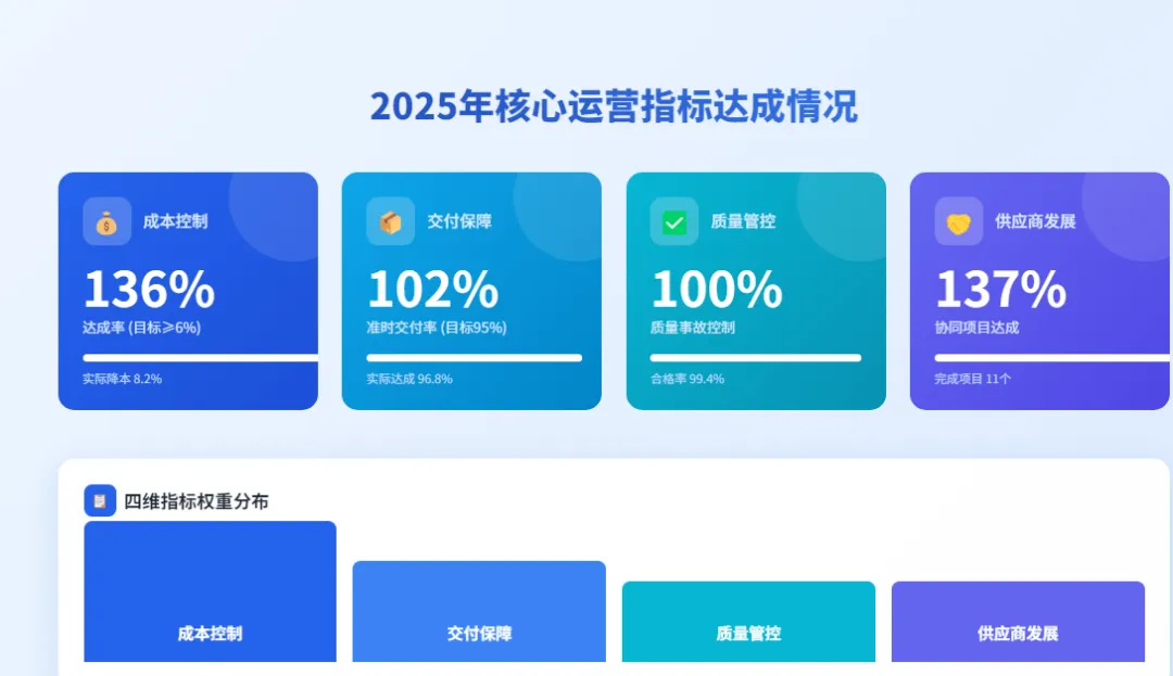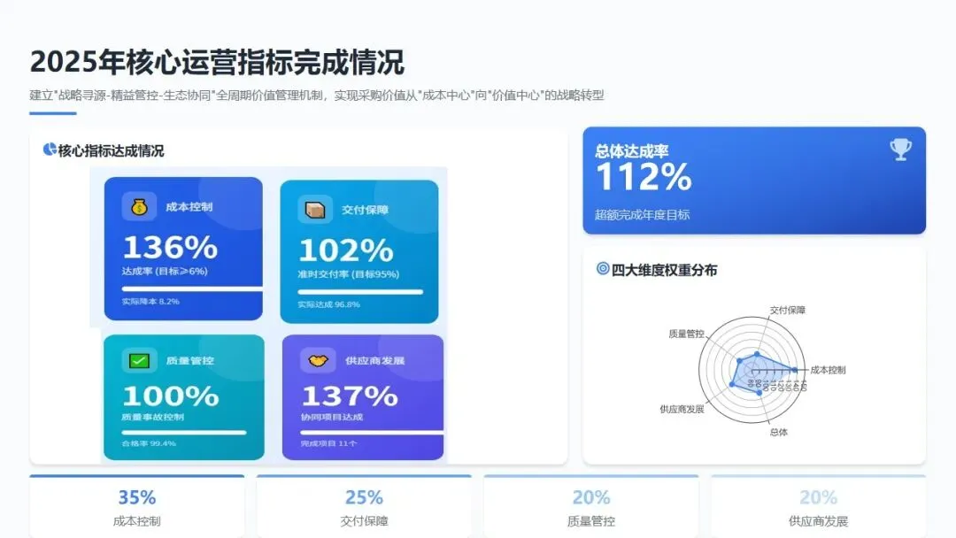 2025年,采购部建立"战略寻源-精益管控-生态协同"的全周期价值管理机制,围绕成本控制、交付保障、质量管控、供应商发展四大维度设定核心指标,整体指标达成率112%,实现采购价值从"成本中心"向"价值中心"的战略转型。具体完成情况如下: