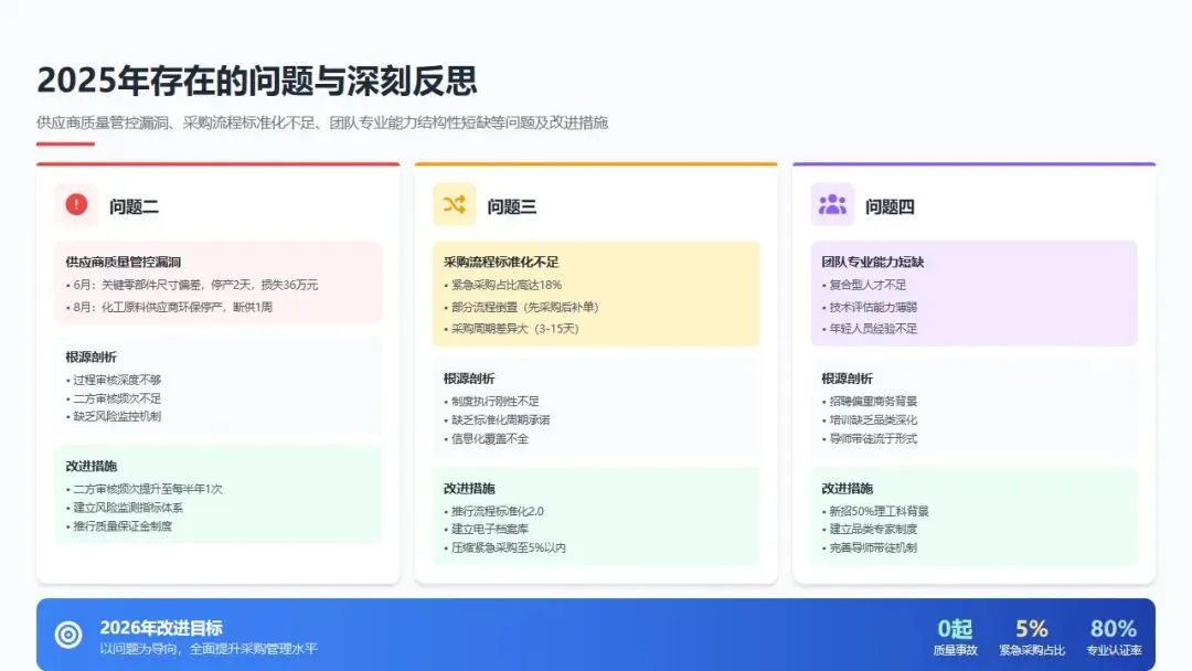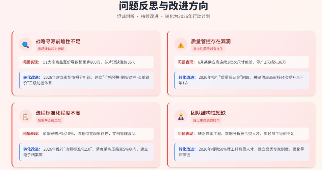 转化改进: 2026年将推行"采购流程标准化2.0",明确各类物料标准采购周期并纳入绩效考核;建立采购文档电子档案库,实现10年历史价格可追溯;大幅压缩紧急采购比例至5%以内,建立特批采购责任追究机制。