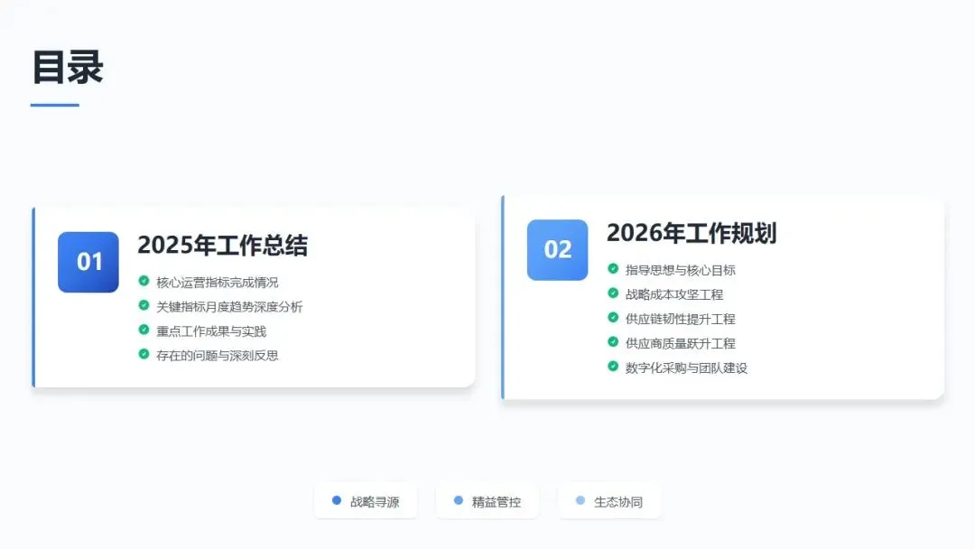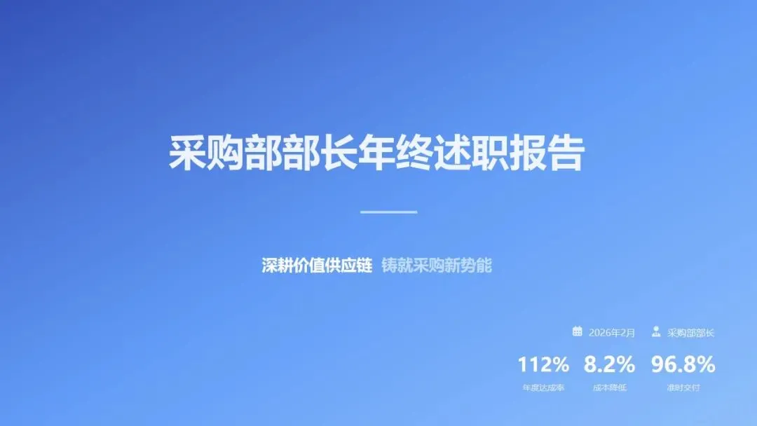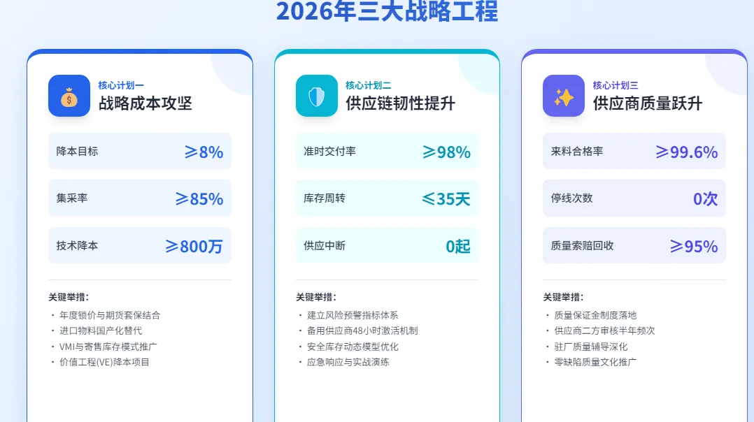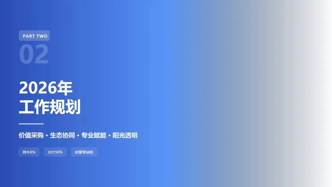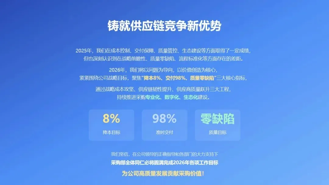 2025年,采购部在成本控制、交付保障、质量管控、生态建设等方面取得了一定成绩,但也深刻认识到在战略前瞻性、质量零缺陷、流程标准化等方面存在的差距。2026年,我们将以问题为导向,以价值创造为核心,紧紧围绕公司战略目标,聚焦"降本8%、交付98%、质量零缺陷"三大核心指标,通过战略成本攻坚、供应链韧性提升、供应商质量跃升三大工程,持续推进采购专业化、数字化、生态化建设。