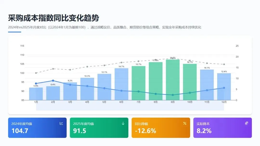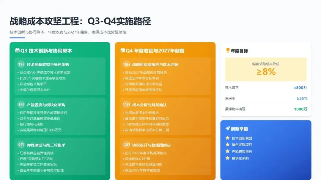 - 12月: 签订2027年度采购框架协议,锁定明年Q1价格;完成降本最佳实践案例库编制;制定2027年降本路线图,确保成本优势延续性。