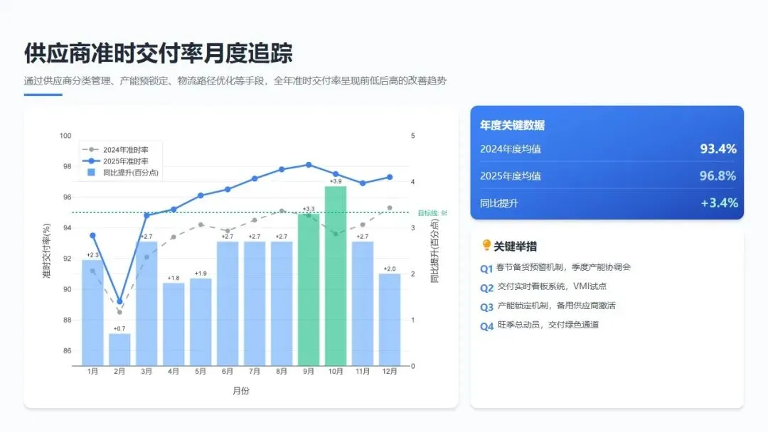 - 4月: 推行"供应商协同计划(CPFR)"试点,与5家战略供应商实现销售预测、库存数据、生产计划的实时共享;优化采购申请-审批-下单流程,将标准采购周期压缩20%。