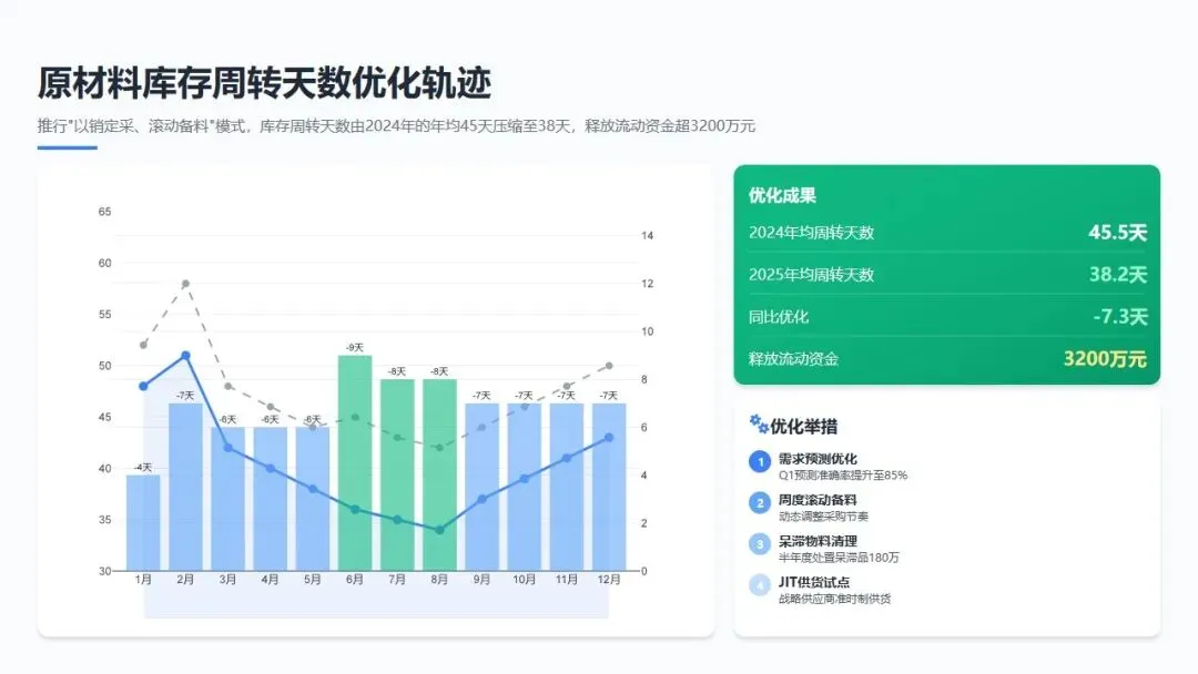 - 8月: 利用暑期生产淡季,与供应商开展"产能置换"谈判,以全年订单量换取更低单价;推行"模块化采购",推动零部件通用化、标准化设计,减少定制件比例;完成呆滞物料清理目标1000万元。