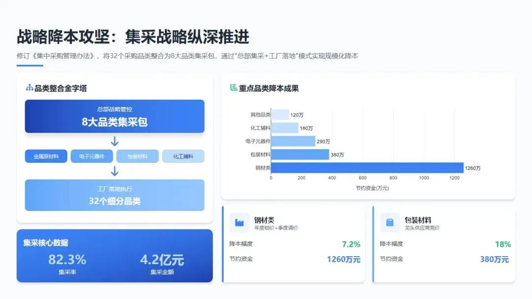 集采战略纵深推进: 修订《集中采购管理办法》,将原先分散的32个采购品类整合为8大品类集采包,成立金属原材料、电子元器件、包装材料、化工辅料四大品类管理中心。通过"总部集采+工厂落地"模式,全年完成集采金额4.2亿元,集采率达到82.3%,较2024年提升11个百分点。其中,钢材类通过年度锁价+季度调价机制,在市场价格上涨15%的背景下仍实现采购成本降低7.2%,节约资金1260万元;包装材料通过引入行业龙头供应商竞价,瓦楞纸箱采购单价下降18%,年节约采购成本380万元。