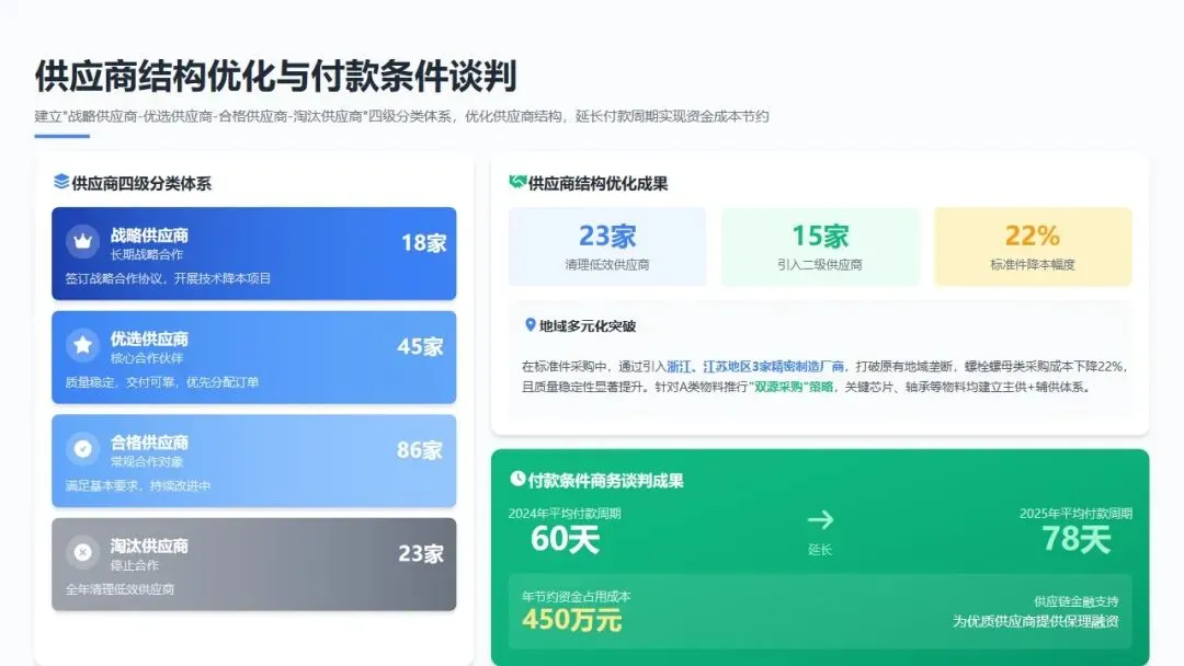 付款条件商务谈判: 充分利用公司信用优势,与核心供应商重新磋商付款条款,将平均付款周期从2024年的60天延长至78天,年节约资金占用成本约450万元。同时,通过供应链金融工具,为优质供应商提供保理融资支持,在延长账期的同时维护供应商合作关系,实现双赢。