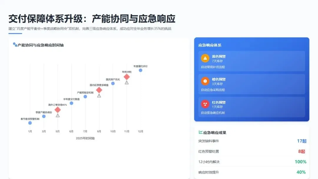 - 5月: 建立"供应商产能可视化管理"平台,实时监控关键供应商产能负荷和排产计划;推行"滚动备料机制",基于3个月滚动预测提前备料长周期物料;完成暑期生产计划与供应商产能匹配。