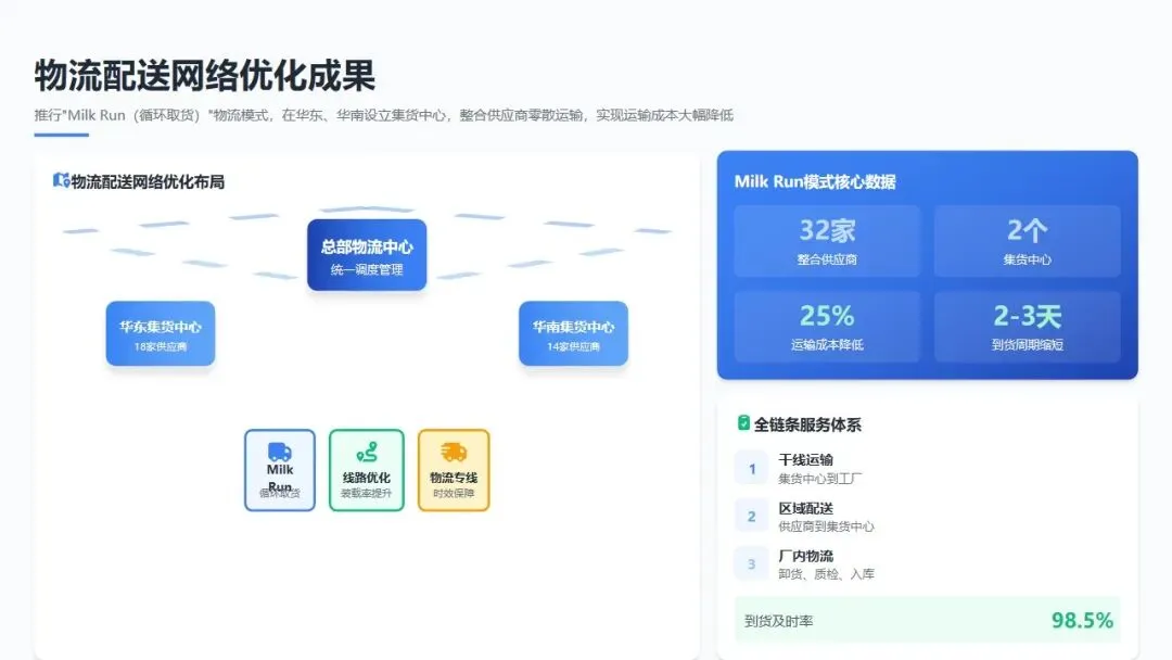 物流配送网络优化: 针对供应商分散、运输成本高的痛点,推行"Milk Run(循环取货)"物流模式,在华东、华南两大产业集聚区设立集货中心,整合32家供应商的零散运输,通过线路优化和装载率提升,降低运输成本25%,同时缩短到货周期2-3天。与3家专业第三方物流签订年度协议,建立"干线运输+区域配送+厂内物流"的全链条服务体系,到货及时率提升至98.5%。