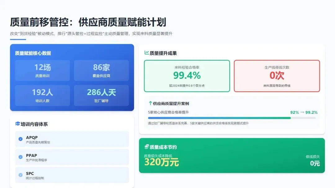 供应商质量赋能计划: 改变以往"到货检验"的被动模式,推行"源头管控+过程监控"的主动质量管理。全年组织供应商质量培训12场,覆盖86家核心供应商的192名质量管理人员,培训内容涵盖APQP(产品质量先期策划)、PPAP(生产件批准程序)、SPC(统计过程控制)等先进质量工具。对关键供应商实施驻厂辅导,全年派出质量工程师驻厂累计286人天,帮助5家供应商建立完善的质控体系,其供货合格率由92%提升至99.2%。