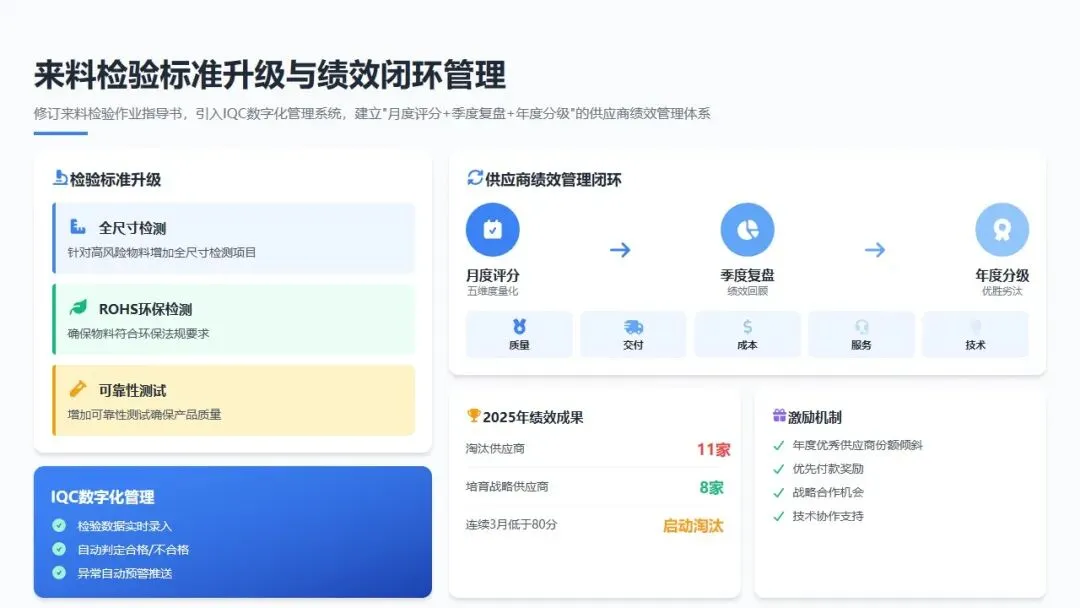 供应商绩效闭环管理: 建立"月度评分+季度复盘+年度分级"的供应商绩效管理体系,从质量、交付、成本、服务、技术五个维度进行量化评估。对连续3个月评分低于80分的供应商启动淘汰程序,对年度优秀供应商给予份额倾斜和优先付款奖励。2025年共淘汰不合格供应商11家,培育战略供应商8家,供应商整体质量水平显著提升。