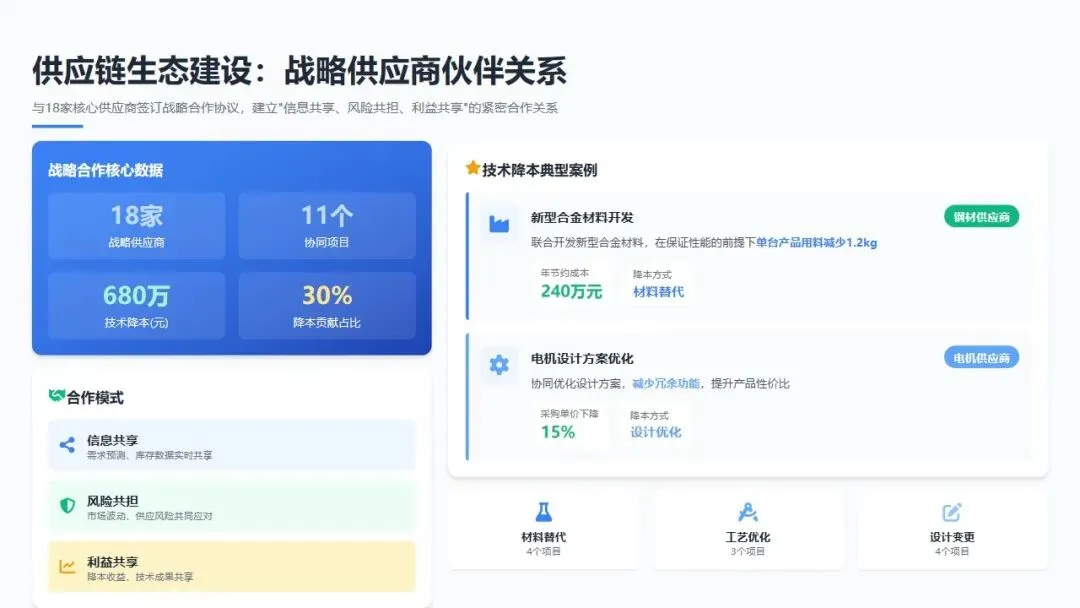 战略供应商伙伴关系深化: 与18家核心供应商签订战略合作协议,建立"信息共享、风险共担、利益共享"的紧密合作关系。联合战略供应商开展技术降本项目11个,通过材料替代、工艺优化、设计变更等方式,实现技术降本680万元。例如,与某钢材供应商联合开发新型合金材料,在保证性能的前提下单台产品用料减少1.2kg,年节约材料成本240万元;与某电机供应商协同优化设计方案,减少冗余功能,采购单价下降15%。