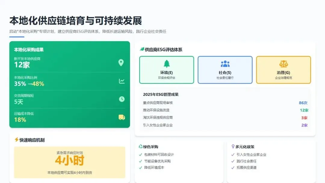 本地化供应链培育: 为降低长途运输风险和供应中断隐患,启动"本地化采购"专项计划,在工厂周边150公里范围内培育配套供应商。全年新开发本地供应商12家,本地化采购比例由2024年的35%提升至48%,缩短交货周期平均5天,降低运输成本18%。同时,建立本地供应商快速响应机制,紧急需求可实现4小时内到货。