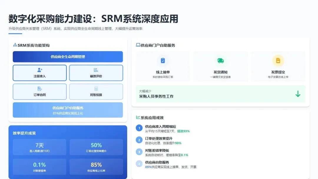 SRM系统深度应用: 升级供应商关系管理(SRM)系统,实现供应商全生命周期线上管理,涵盖注册准入、绩效评价、订单协同、对账结算全流程。系统上线后,供应商准入周期由平均15天缩短至7天,订单处理效率提升50%,对账差错率降低至0.1%。推行供应商门户自助服务,85%的供应商实现线上接单、发货通知、发票提交,大幅减少采购人员事务性工作。