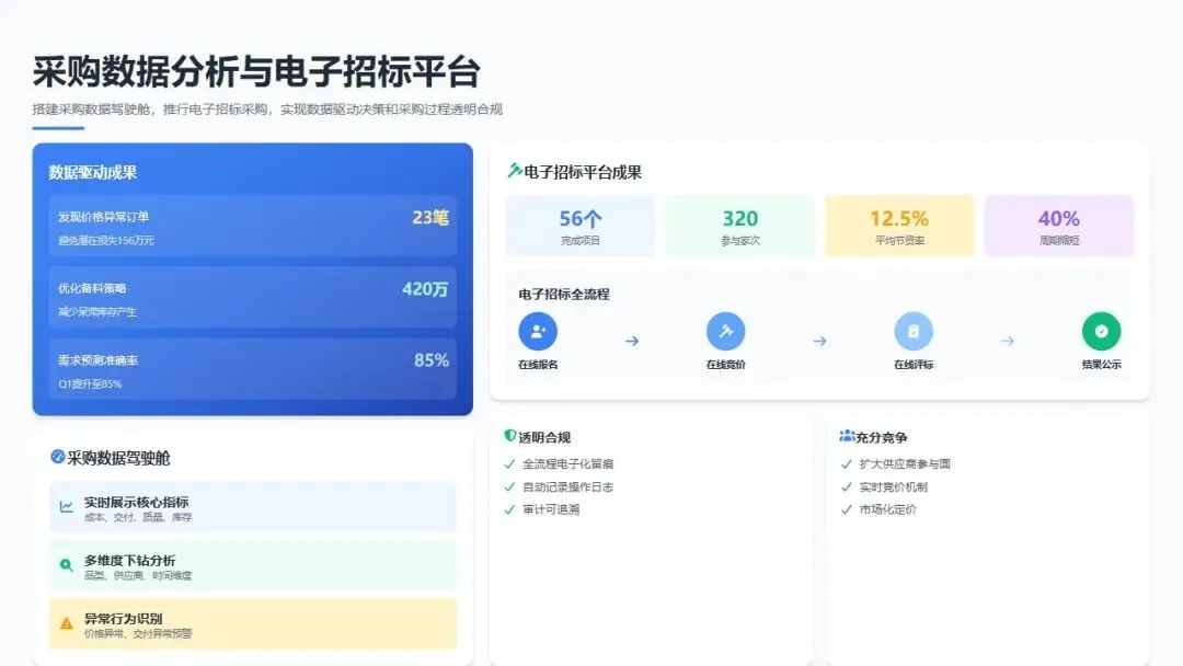 电子招标平台推广: 针对标准件、辅料等竞争充分的品类,推行电子招标采购,实现供应商在线报名、竞价、评标全流程电子化。全年完成电子招标项目56个,参与供应商达320家次,平均节资率12.5%,同时招标周期缩短40%,采购过程更加透明合规。
