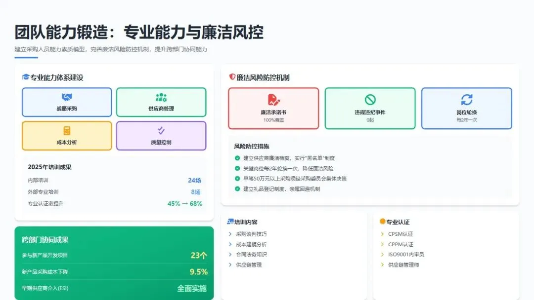 专业能力体系建设: 建立采购人员能力素质模型,划分战略采购、供应商管理、成本分析、质量控制四大专业方向,制定差异化培养方案。全年组织内部培训24场,外部专业培训8场,覆盖采购谈判技巧、成本建模、合同法务、供应链管理等专业领域。部门员工专业认证率(CPSM、CPPM等)由2024年的45%提升至68%。