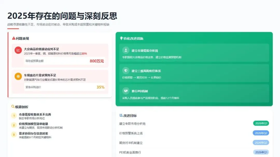 转化改进: 2026年将建立"市场情报分析岗",专职跟踪大宗商品价格走势;建立"价格预警-期货对冲-长单锁价"三级风险防控体系;推行"采购早期介入(PEI)"机制,采购人员提前参与产品规划阶段,提前12个月备料。