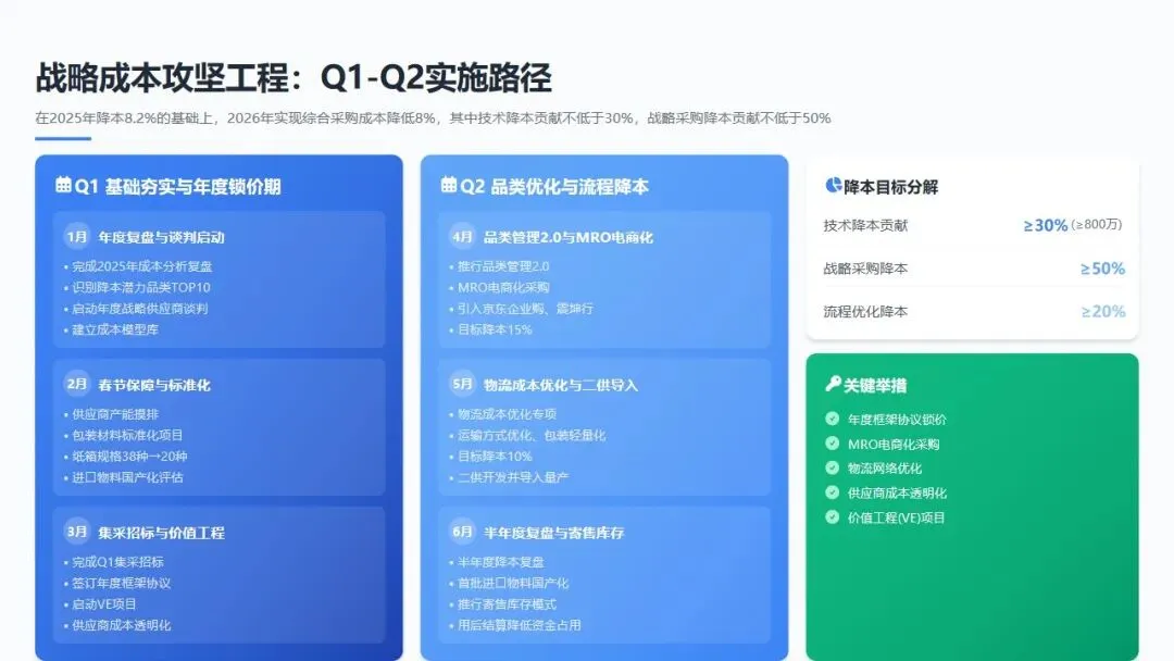 - 1月: 完成2025年全品类成本分析复盘,识别降本潜力品类TOP10;启动年度战略供应商谈判,锁定Q2-Q3大宗物料价格;建立"成本模型库",完成A类物料标准成本模型搭建。