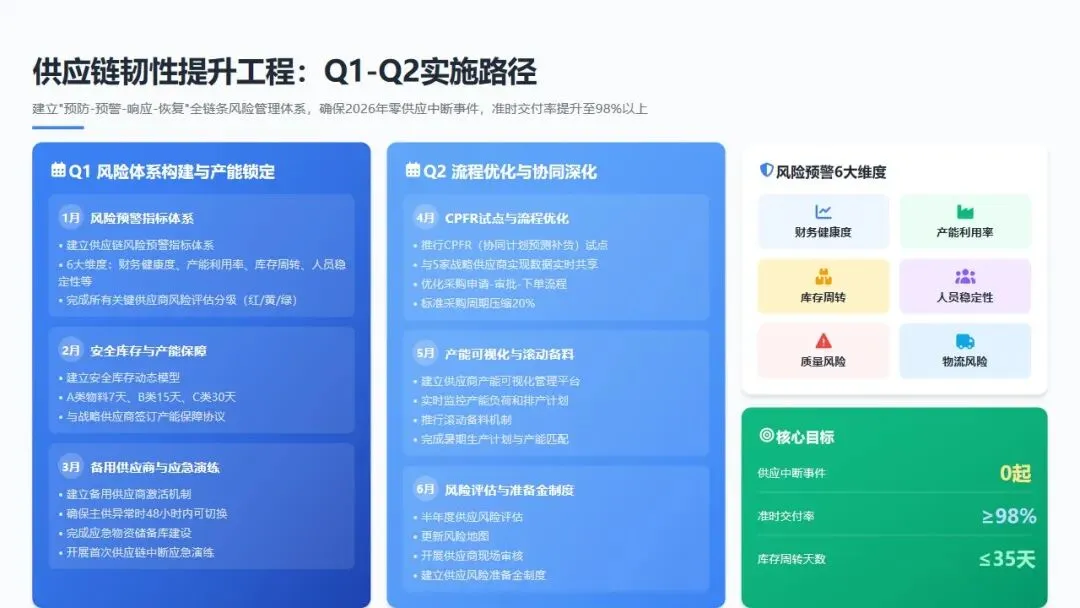 战略目标: 建立"预防-预警-响应-恢复"的全链条风险管理体系,确保2026年零供应中断事件,准时交付率提升至98%以上,库存周转天数压缩至35天以内。