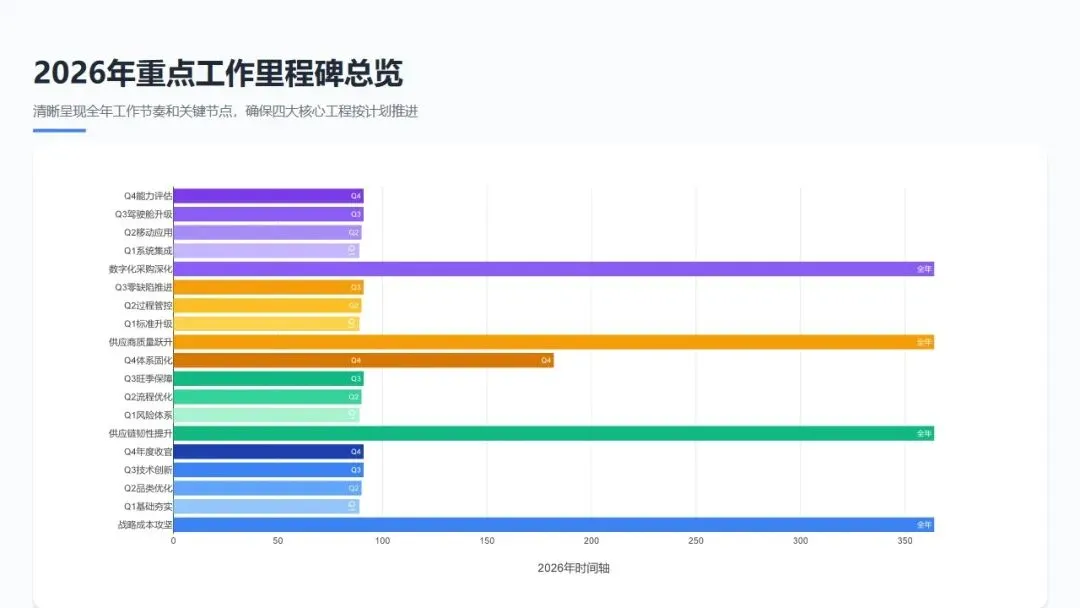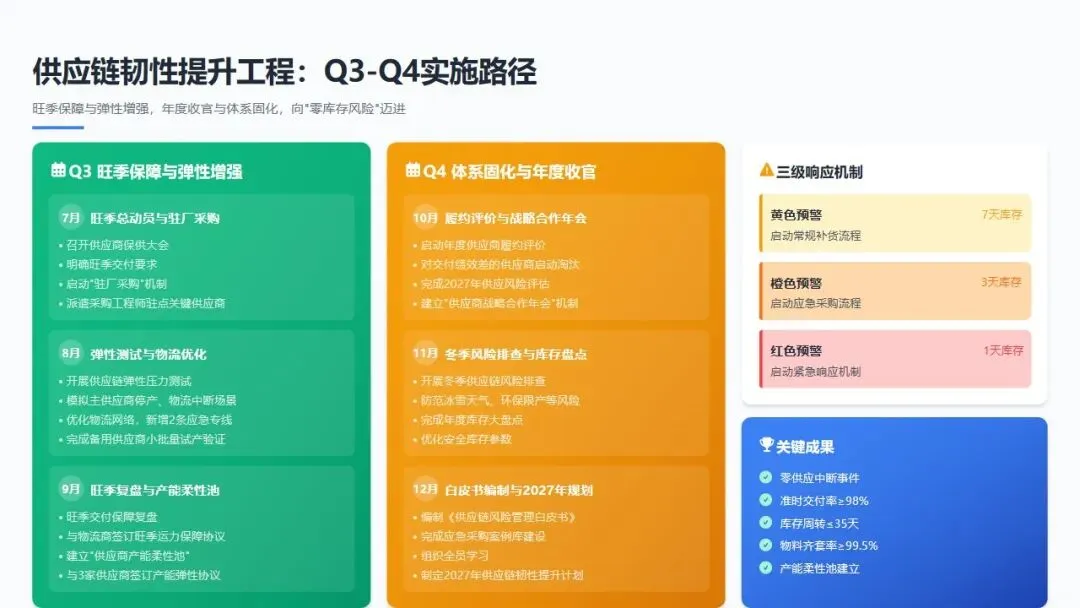 - 12月: 编制《供应链风险管理白皮书》,沉淀全年经验;完成应急采购案例库建设,组织全员学习;制定2027年供应链韧性提升计划,目标向"零库存风险"迈进。
