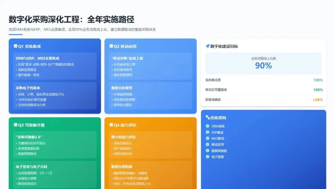 Q1: 完成SRM系统与ERP、MES系统的全面集成,实现"需求-采购-库存-生产"数据实时联动;建立采购电子档案库,实现合同、订单、验收单全流程电子化。Q2: 推行"移动采购"应用,采购人员可通过手机端审批订单、查询库存、接收预警;建立采购数据分析模型,实现价格趋势预测、供应商风险预警、库存优化建议等智能分析。Q3: 建立"采购驾驶舱2.0",实现关键指标实时可视化;推行电子签章和电子合同,合同签署周期由5天缩短至1天;建立"采购知识库",沉淀历史价格、供应商信息、谈判记录等数据。Q4: 开展采购数字化能力评估,优化系统功能;建立"数据治理"机制,确保采购数据准确性、完整性;制定2027年数字化采购路线图,目标实现90%业务流程线上化。