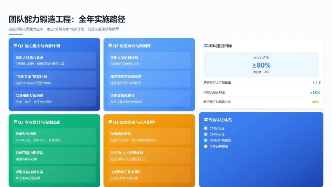 Q1: 完成采购人员能力盘点,识别能力短板;制定"采购专家"培养计划,选拔5名高潜人员重点培养;开展"品类知识"专项培训(机械、电子、化工)。Q2: 推行"采购人员轮岗计划",关键岗位轮岗率100%;开展"商务谈判实战训练营",通过情景模拟提升谈判技巧;建立"采购案例库",每月分享成功/失败案例。Q3: 组织外部专业培训(CPSM认证、成本分析、合同法务);开展"导师带徒"中期评估,确保传帮带效果;举办"采购技能比武大赛",营造比学赶超氛围。Q4: 完成年度绩效考核,实施末位淘汰(后5%人员调岗或淘汰);制定2027年人才招聘计划,重点招聘具备成本工程背景的人才;编制《采购部工作手册》,沉淀标准化作业流程。