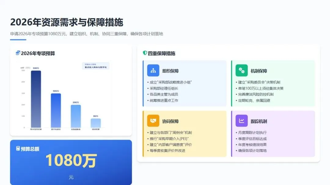 成立"采购部战略推进小组",由采购部经理任组长,各品类主管为成员,统筹推进2026年重点工作。建立"月度跟踪、季度评估、年度考核"机制,确保各项计划落地。