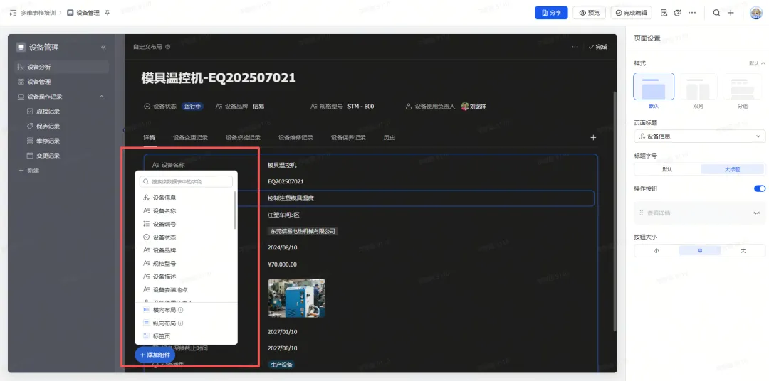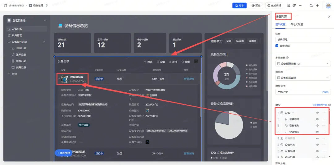 聚合字段:设备包含内容: - 图片字段(设备照片) - 文本字段(设备名称) - 文本字段(设备编号)布局:图片在左,文字在右折叠列表还提供了两种查看详情的方式: