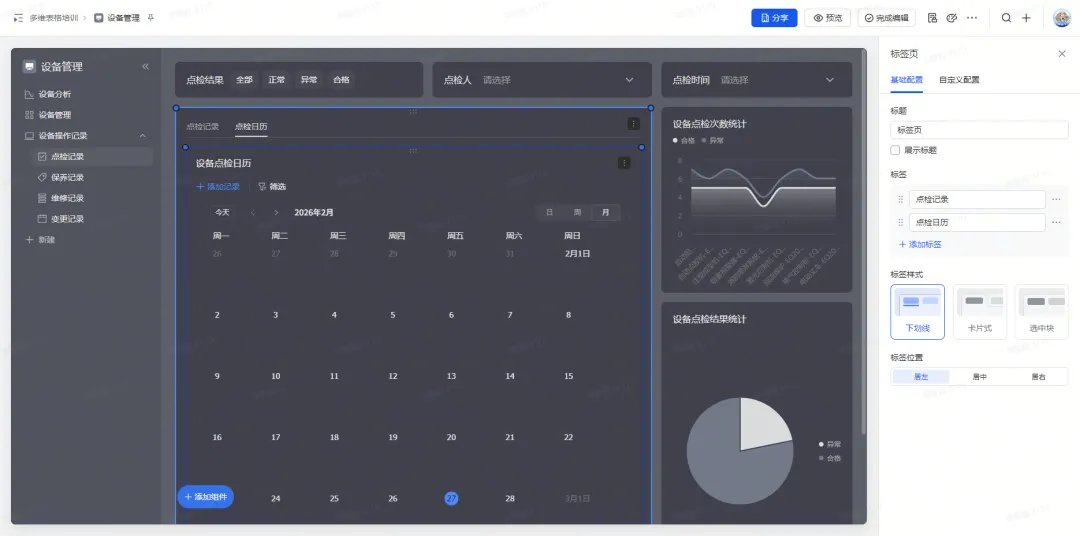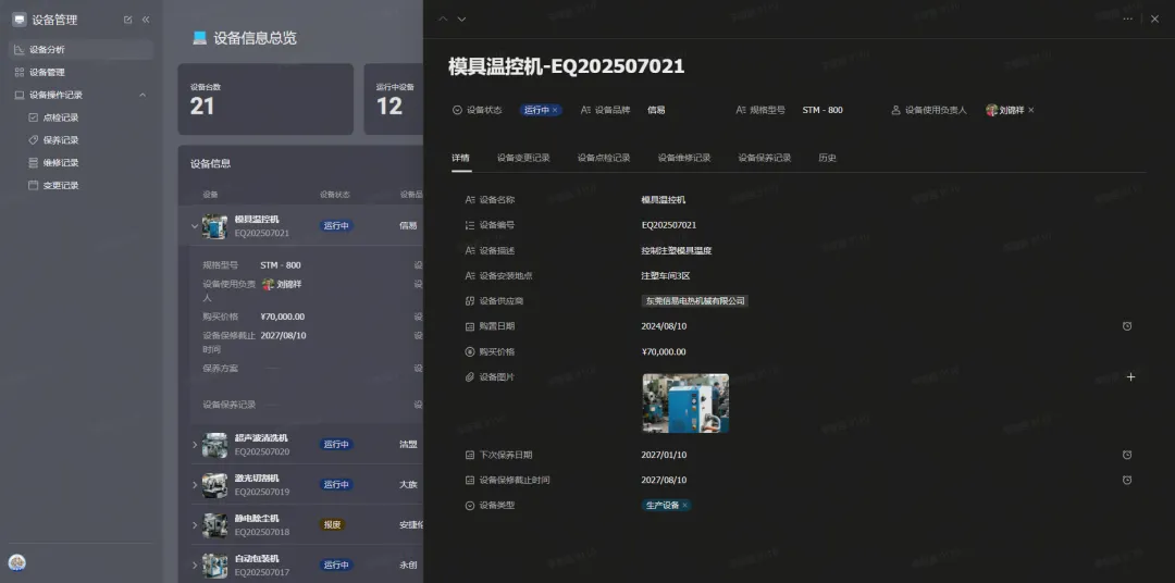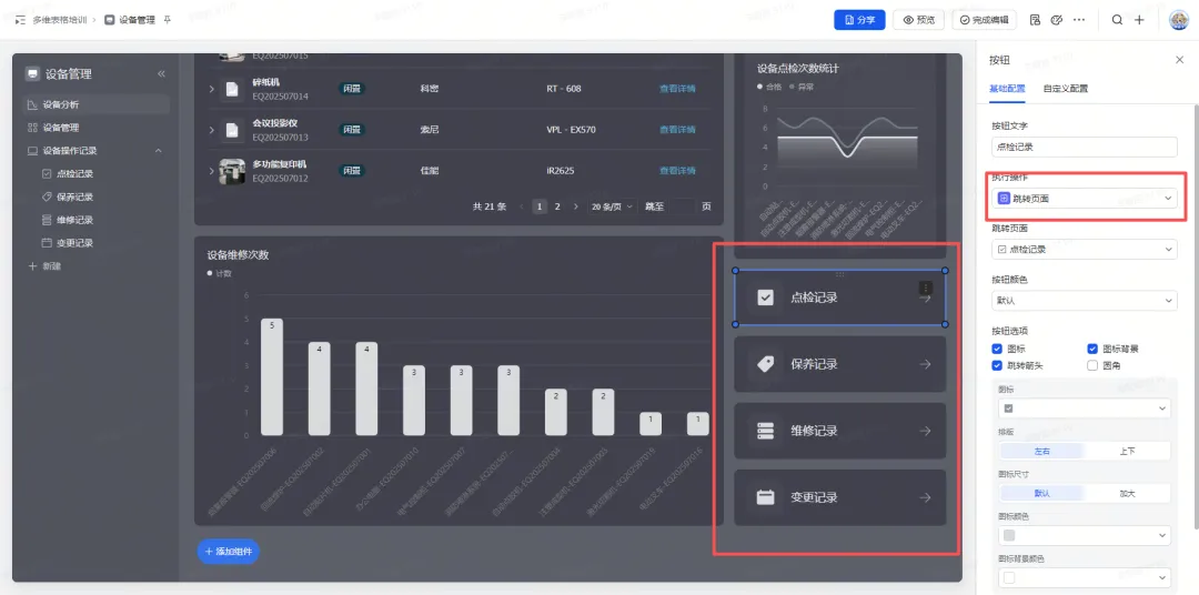 触发条件:维修记录表中状态变为维修完成执行动作:自动修改设备数据表中对应设备的状态为运行中效果:维修工只管修,系统自动维护状态。